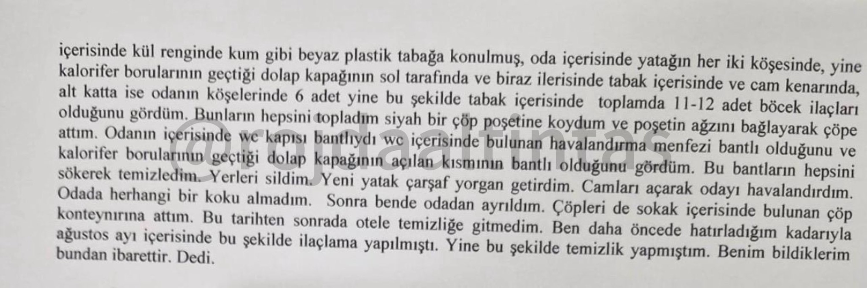 Çöpleri konteynırına attım. Bu tarihten sonrasında otele temizliğe gitmedim. Ben daha öncede hatırladığım kadarıyla ağustos ayı içerisinde bu şekilde ilaçlama yapılmıştı. Yine bu şekilde temizlik yapmıştım. Benim bildiklerim bundan ibarettir.