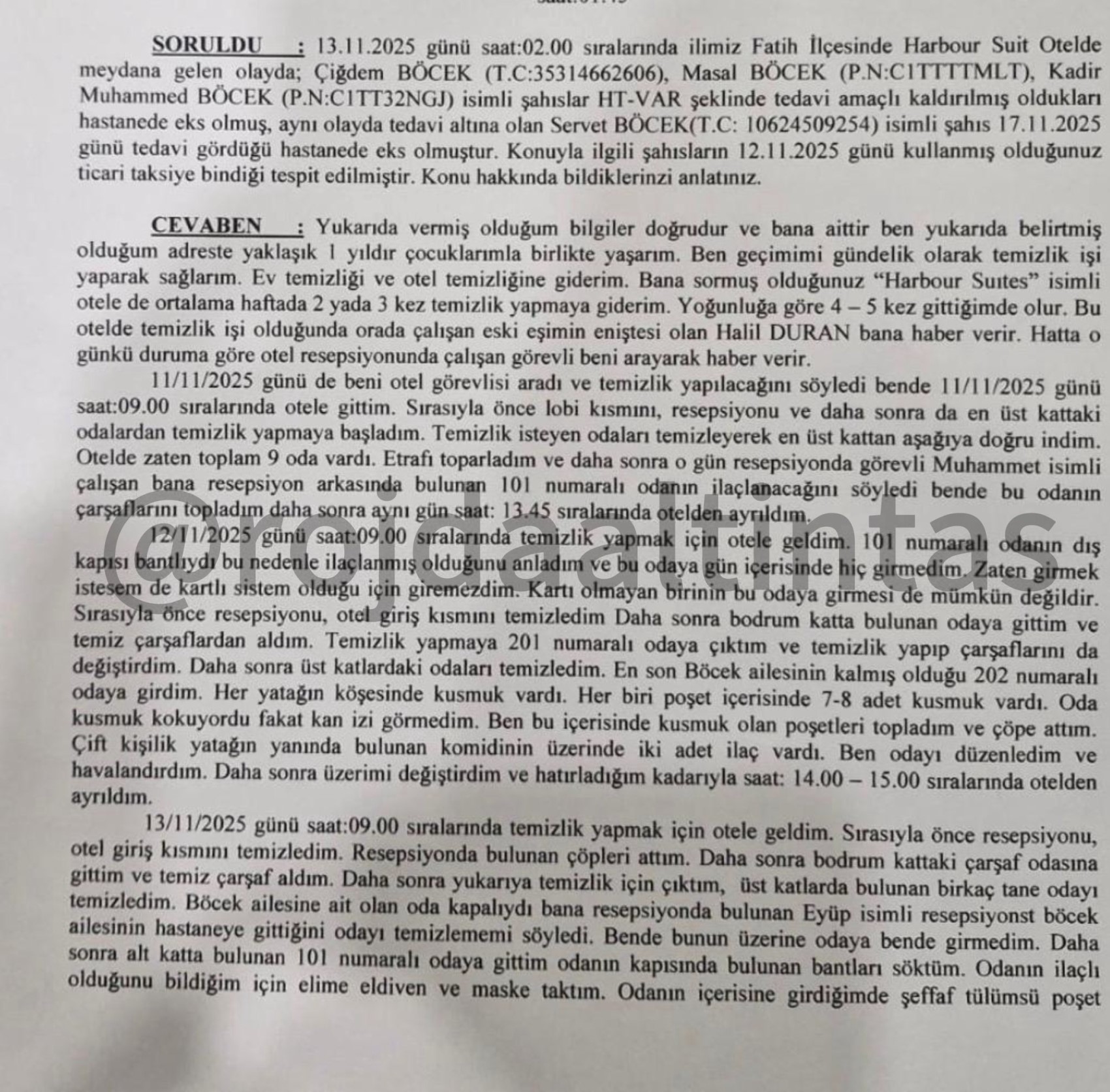 Zehirlenme şüphesiyle hayatını kaybeden Böcek ailesinin odasını temizleyen, temizlik görevlisinin ifadesi ortaya çıktı.