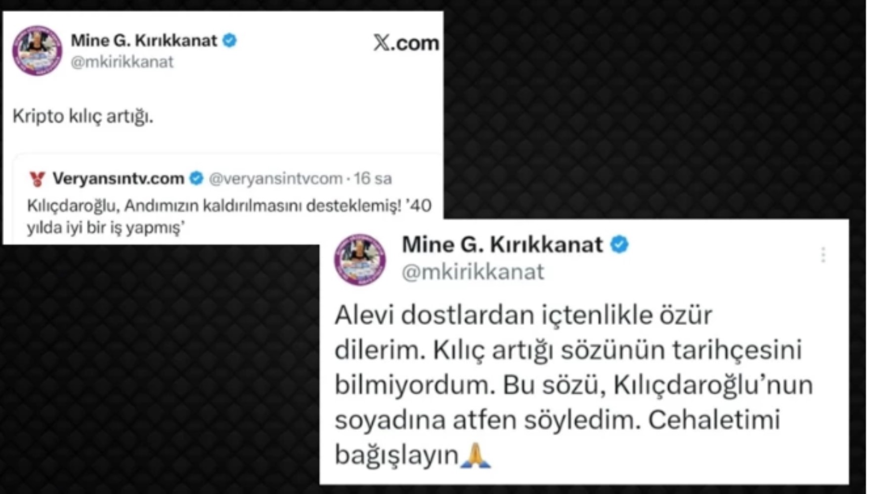 Mine Kırıkkanat, paylaşımının altına gelen yorumlardan sonra yeni bir paylaşım daha yaparak "Alevi dostlardan içtenlikle özür dilerim. Kılıç artığı sözünün tarihçesini bilmiyordum. Bu sözü Kılıçdaroğlu'nun soyadına atfen söyledim. Cehaletimi bağışlayın" dedi. Ancak bu özür de tepkileri dindirmedi.