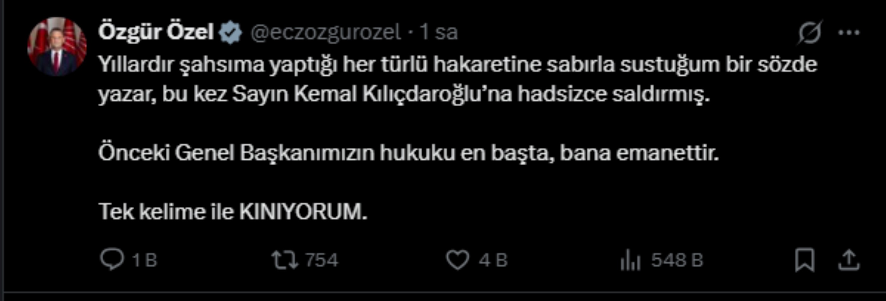 "Yıllardır şahsıma yaptığı her türlü hakaretine sabırla sustuğum bir sözde yazar, bu kez Sayın Kemal Kılıçdaroğlu’na hadsizce saldırmış. Önceki Genel Başkanımızın hukuku en başta, bana emanettir. Tek kelime ile KINIYORUM."