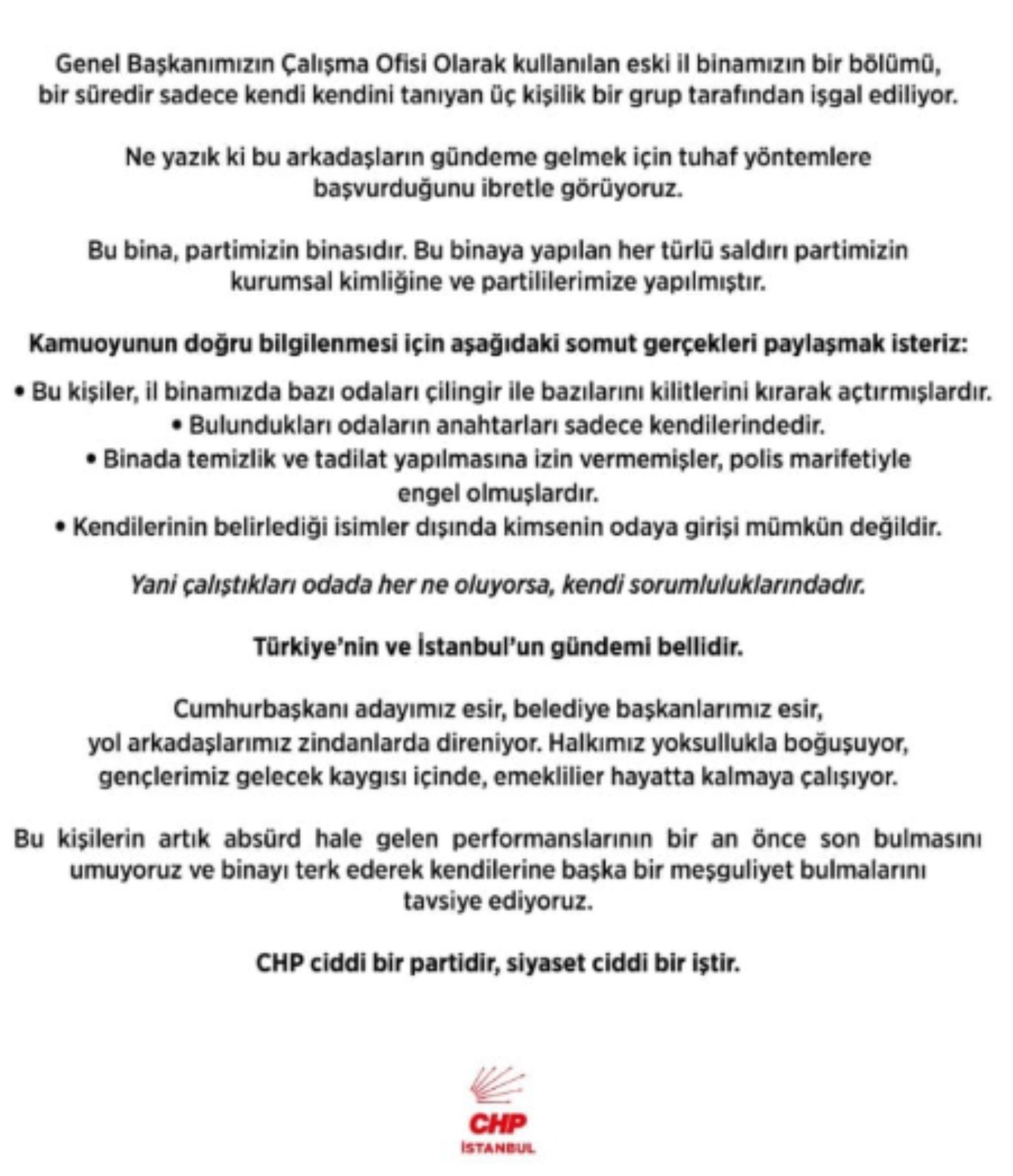 "Genel Başkanımızın Çalışma Ofisi Olarak kullanılan eski il binamızın bir bölümü, bir süredir sadece kendi kendini tanıyan üç kişilik bir grup tarafından işgal ediliyor" denilen açıklamada şunlara yer verildi:,