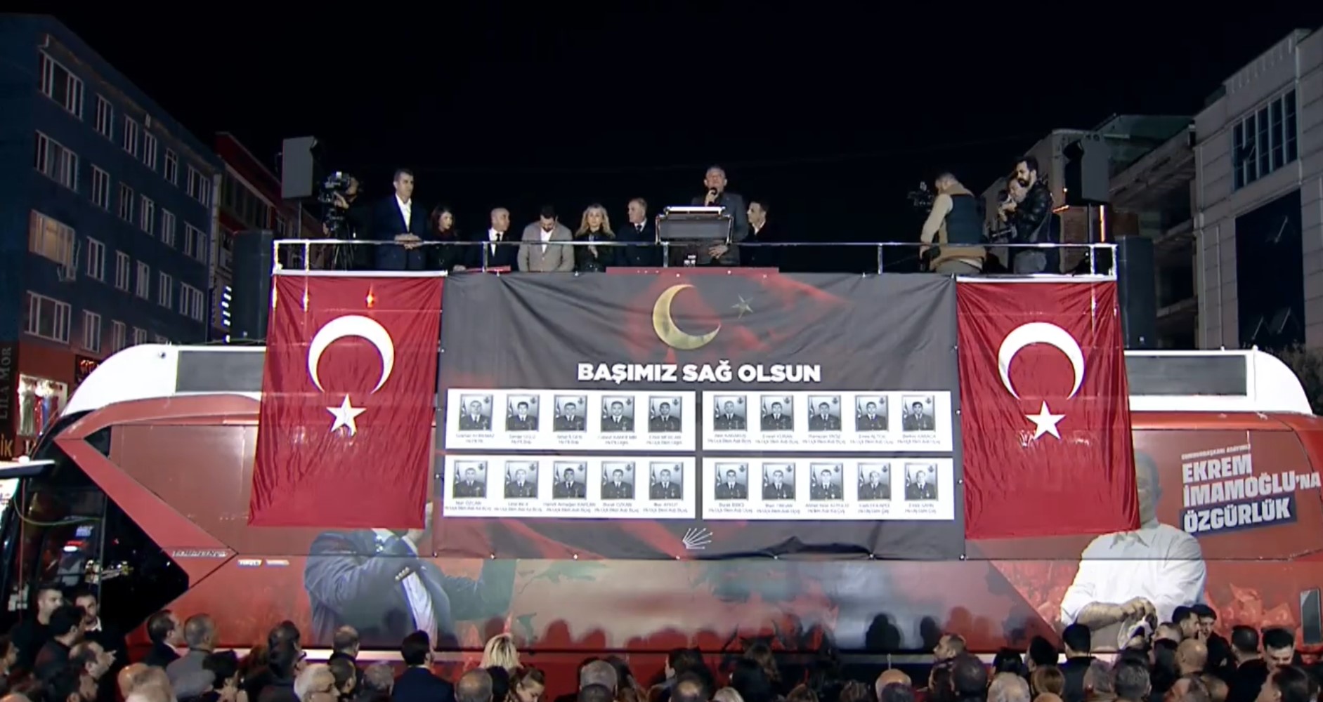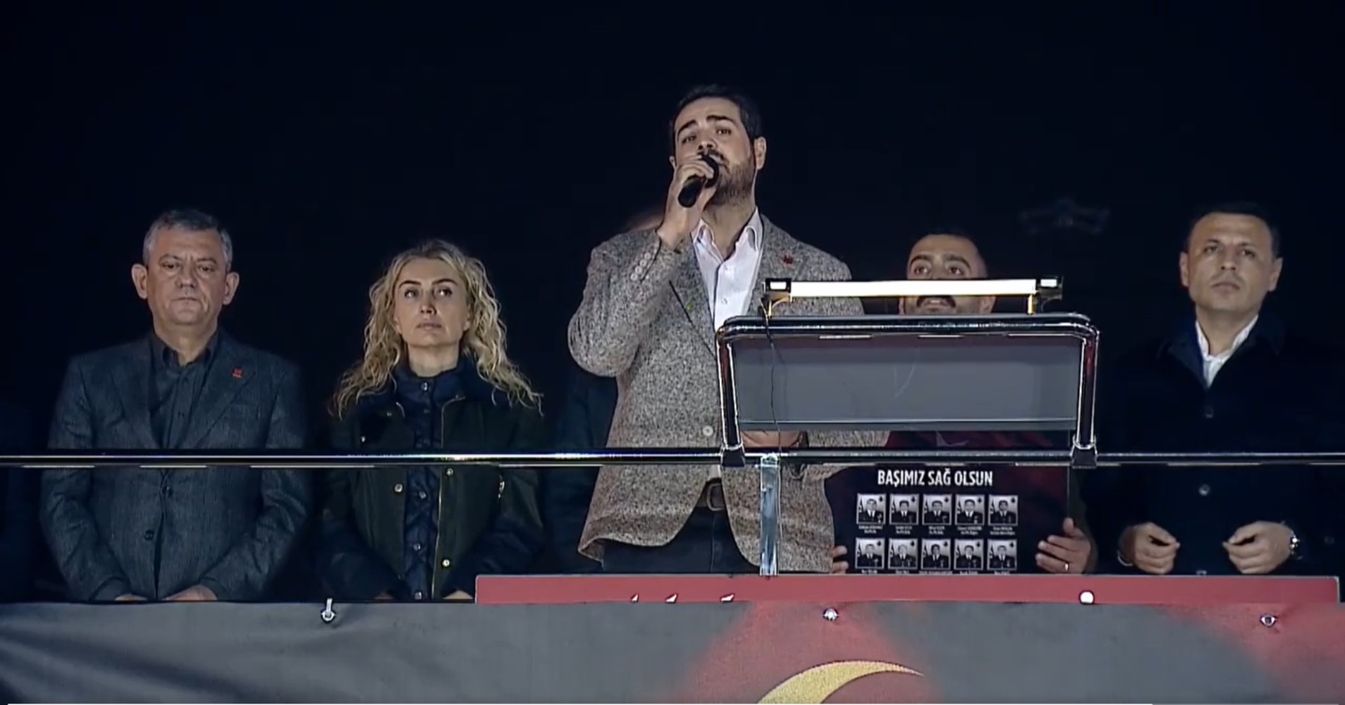 "İlk kez bugün mitingimizde şarkılar çalmadı, çalmayacak. 20 pırıl pırıl askerimizi, canımızı kaybettik. Onun için bugün burada şarkı yok, neşe yok. Herkesi 1 dakikalık saygı duruşuna ve İstiklal Marşı'mızı okumaya davet ediyorum.