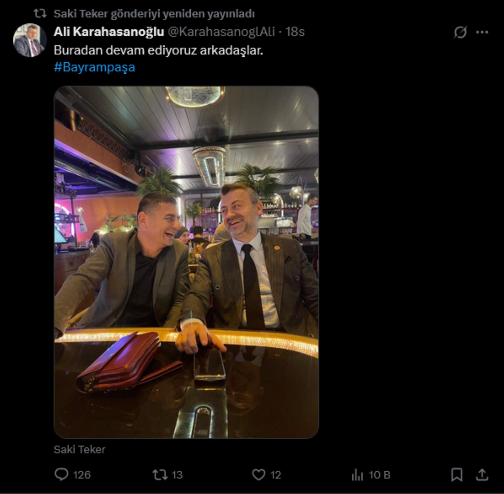 CHP'den istifa ederek AKP'ye geçen Bayrampaşa Belediye Meclis Üyeleri Ali Karahasanoğlu ve Sadi Teker'in "Buradan devam ediyoruz arkadaşlar" notuyla paylaştıkları kahkaha pozu sosyal medyada tepki çekti.