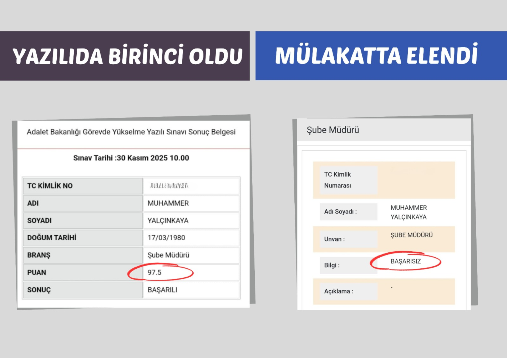 “Adalet Bakanlığı şube müdürlüğü sınavında 97,5 puanla Türkiye birincisi olan Muhammer Yalçınkaya mülakatta elendi. Türkiye'de adaleti sağlamakla görevli Adalet Bakanlığı, bizzat kendi personeline yaptığı adaletsizliklerle tarihe geçti.