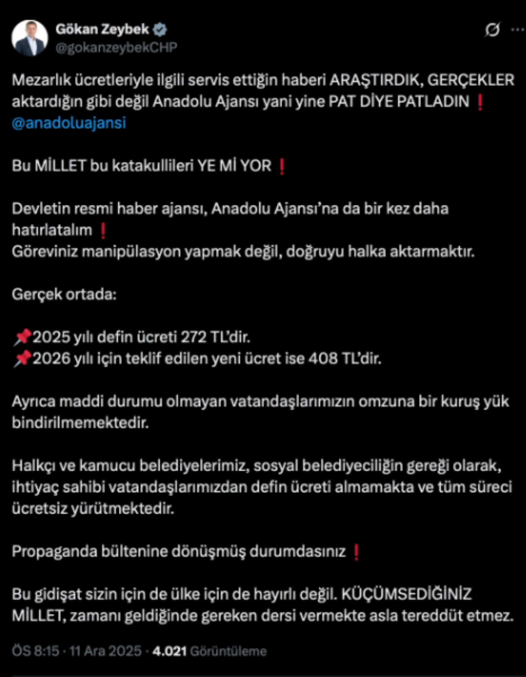 CHP Genel Başkan Yardımcısı Gökan Zeybek, Anadolu Ajansı'nın 'İstanbul’da mezarlıklara yüzde 200 zam' şeklinde servis ettiği habere tepki gösterdi.