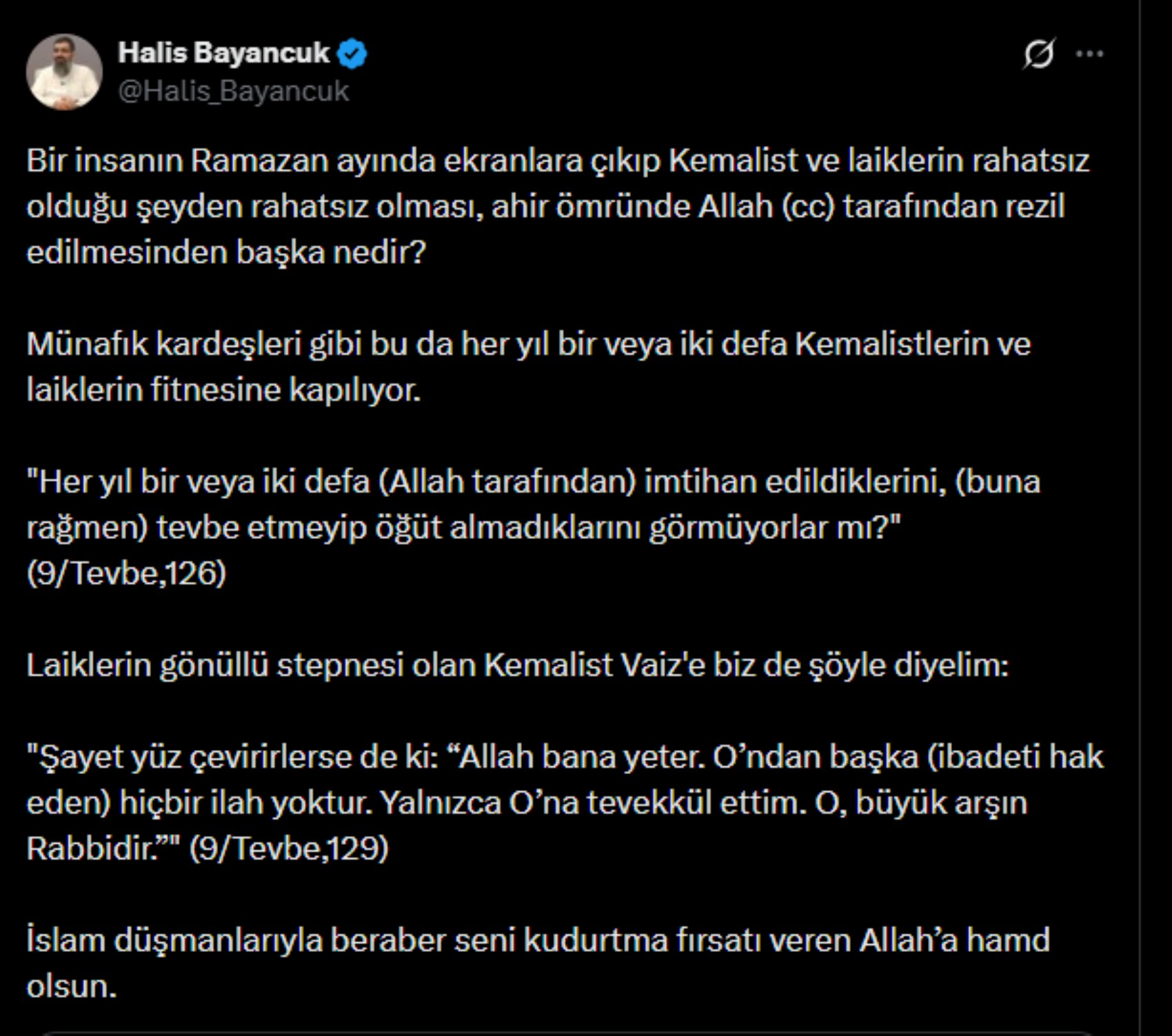 Bir insanın Ramazan ayında ekranlara çıkıp Kemalist ve laiklerin rahatsız olduğu şeyden rahatsız olması, ahir ömründe Allah (cc) tarafından rezil edilmesinden başka nedir?
