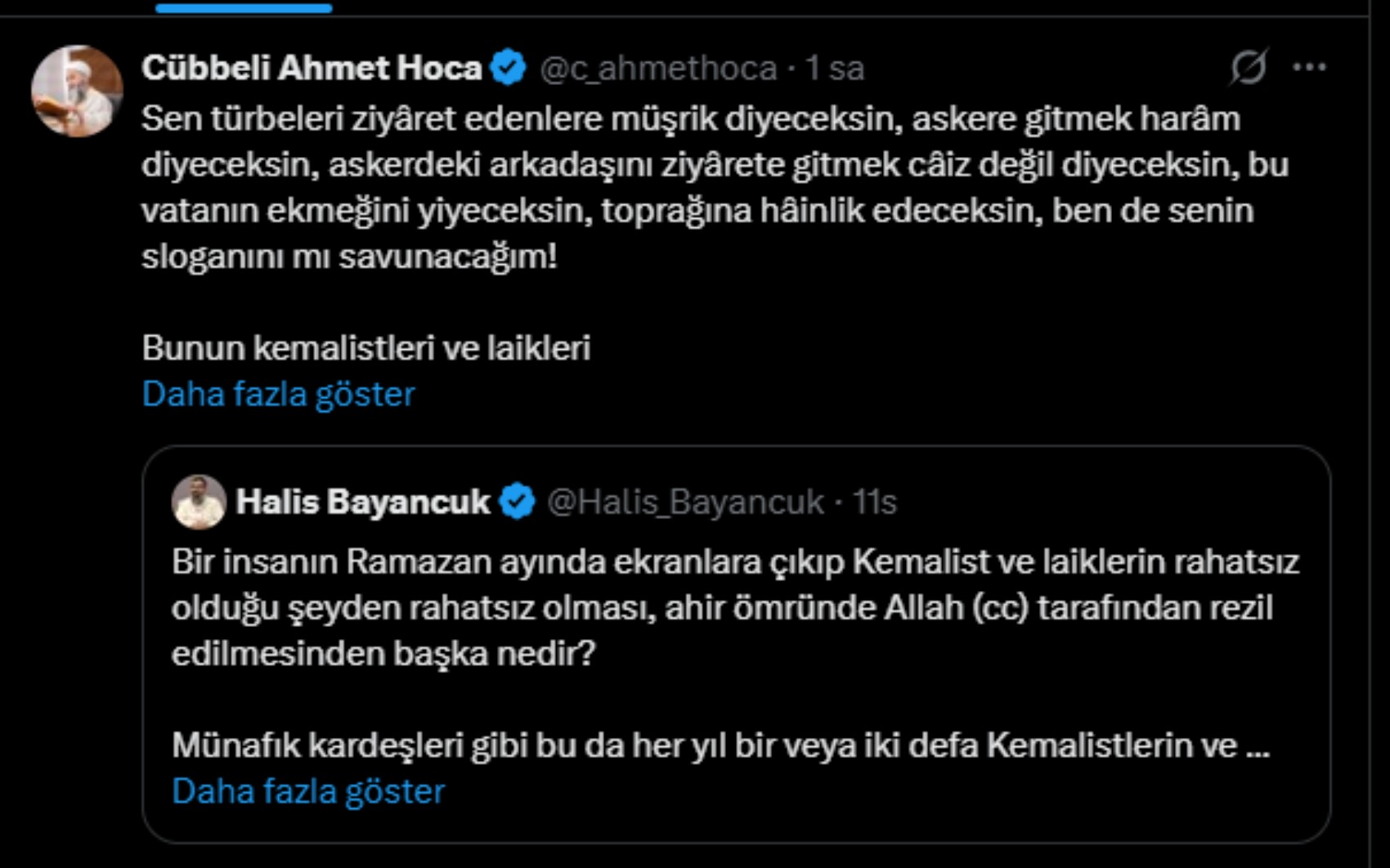Öğrencilere okutulan yemine tepki gösteren Cübbeli Ahmet ile yeminin arkasındaki isim Halis Bayancuk sosyal medya hesapları üzerinden birbirine göndermede bulundu.