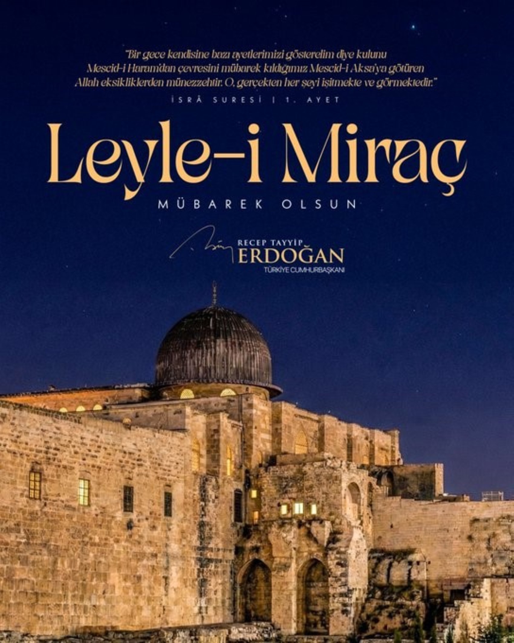 Erdoğan, sosyal medya hesabından yayımladığı mesajında, "Aziz milletimizin ve İslam âleminin Leyle-i Miraç’ını tebrik ediyor; bu mübarek gecenin tüm insanlığa hayırlar getirmesini, huzura vesile olmasını Rabb’imden niyaz ediyorum. Gecemiz mübarek olsun" ifadelerini kullandı.
