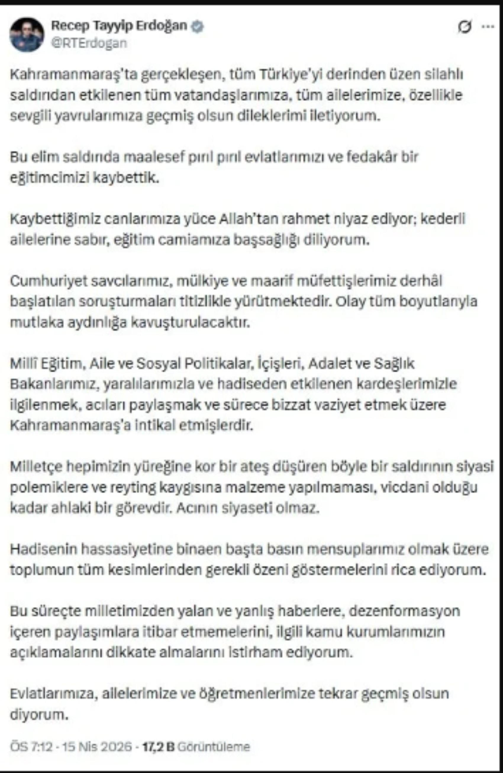 Milletçe hepimizin yüreğine kor bir ateş düşüren böyle bir saldırının siyasi polemiklere ve reyting kaygısına malzeme yapılmaması, vicdani olduğu kadar ahlaki bir görevdir. Acının siyaseti olmaz. Hadisenin hassasiyetine binaen başta basın mensuplarımız olmak üzere toplumun tüm kesimlerinden gerekli özeni göstermelerini rica ediyorum. Bu süreçte milletimizden yalan ve yanlış haberlere, dezenformasyon içeren paylaşımlara itibar etmemelerini, ilgili kamu kurumlarımızın açıklamalarını dikkate almalarını istirham ediyorum. Evlatlarımıza, ailelerimize ve öğretmenlerimize tekrar geçmiş olsun diyorum.