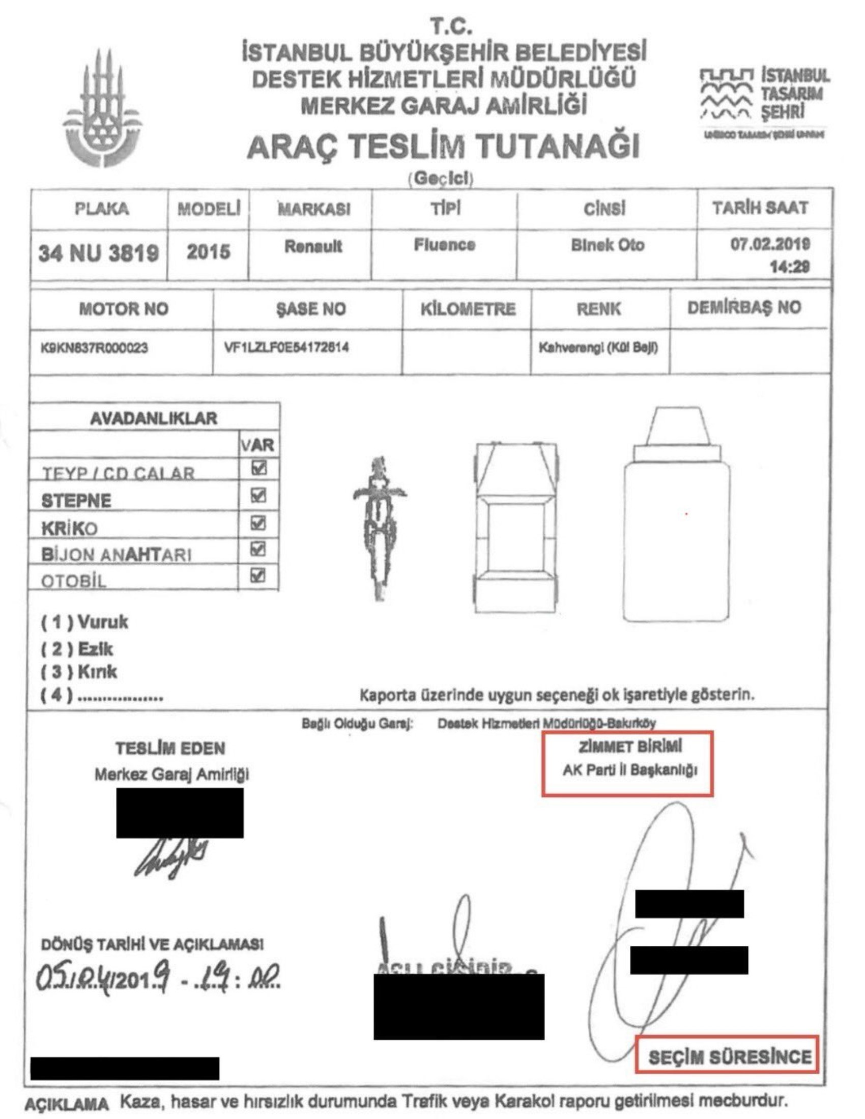 Aşağıda belirttiğim makam aracının, AKP dönemi İBB’de, AKP İstanbul İl Başkanlığı’na ‘31 Mart 2019 yerel seçimi süresince’ tahsis edildiğini belgeledik.