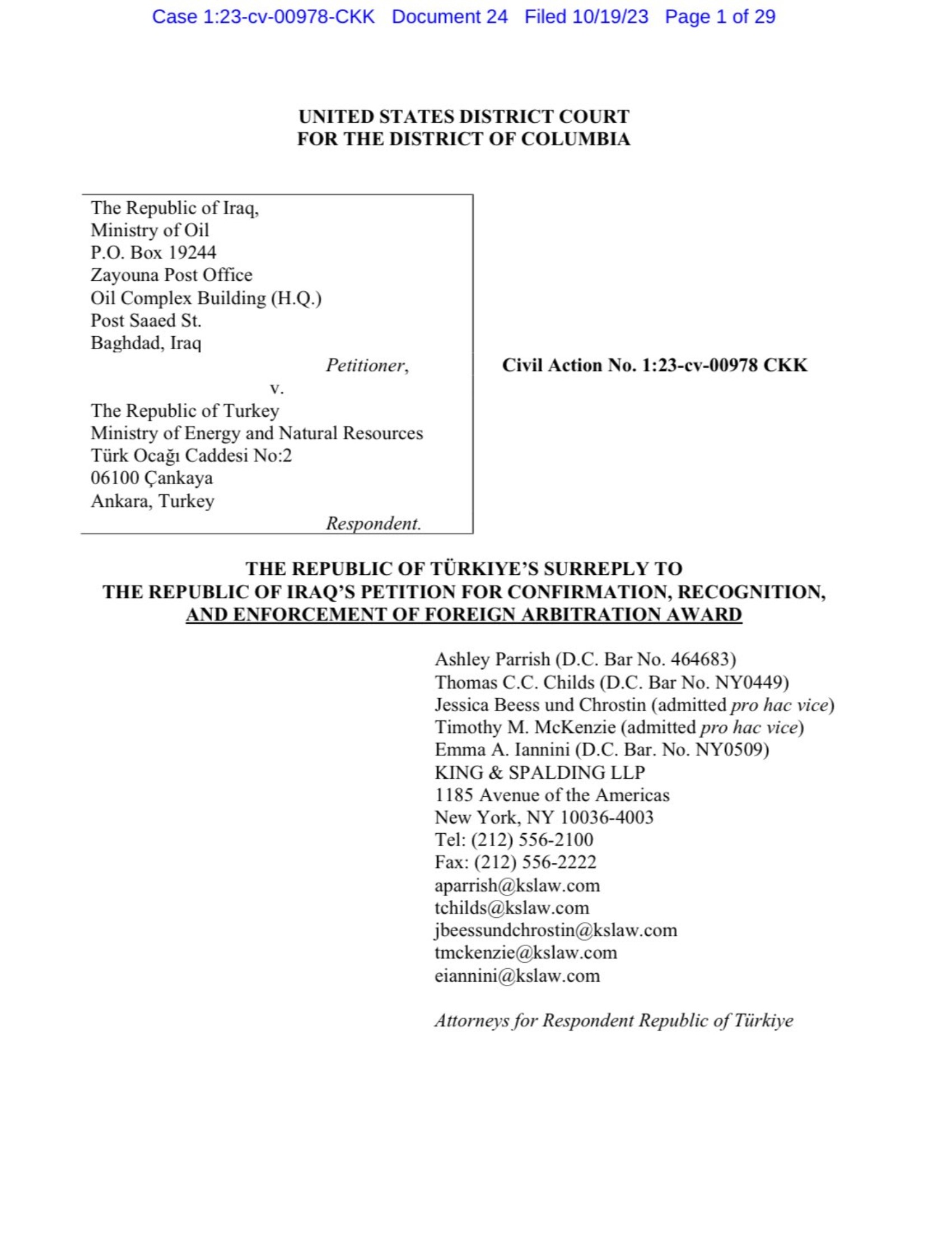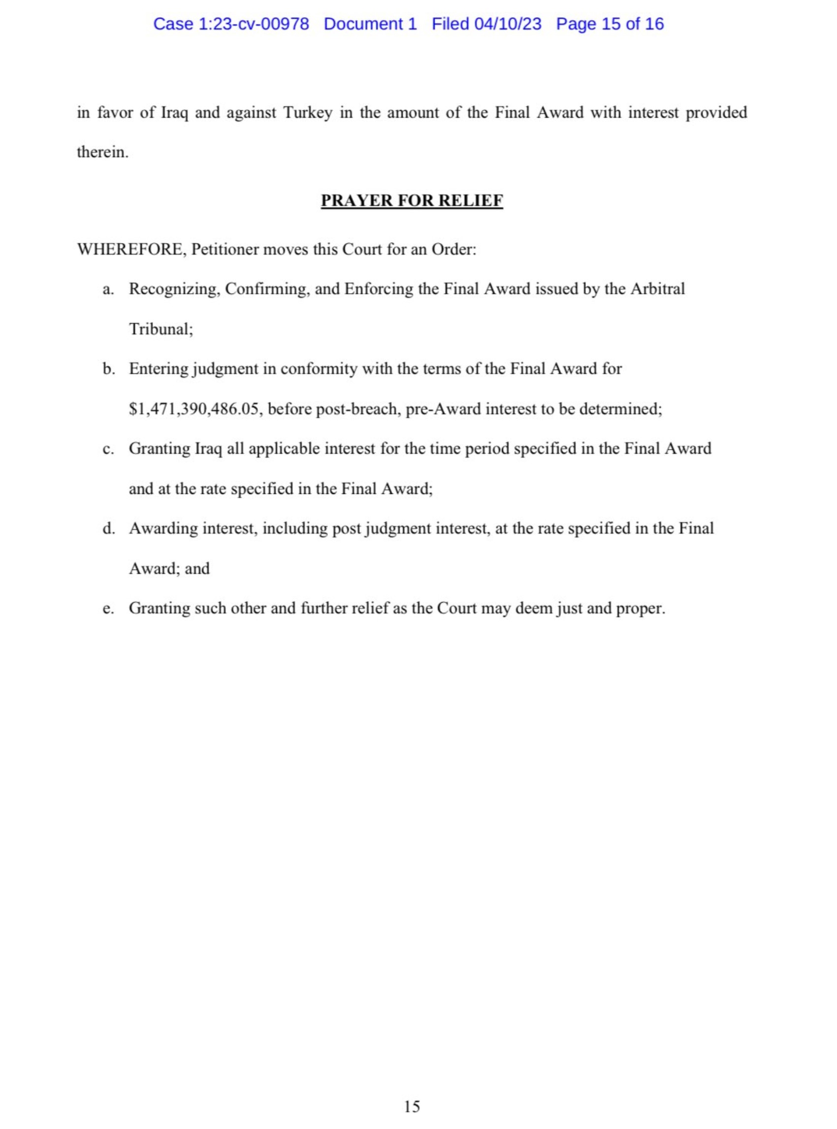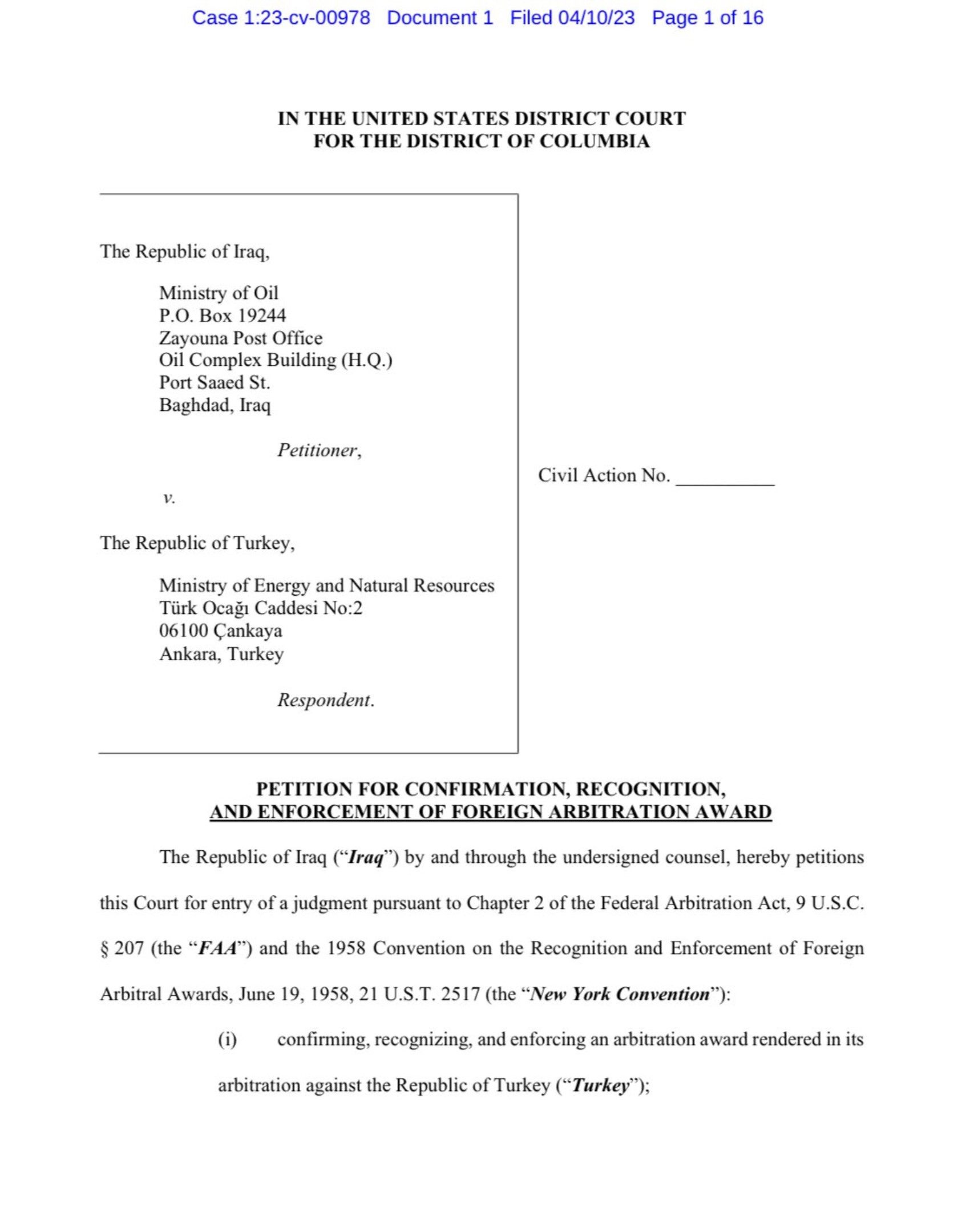 Amerika’da, Washington DC’de, Irak’ın bu parayı tahsil etmek için başvurduğu tenfiz mahkemesinde,