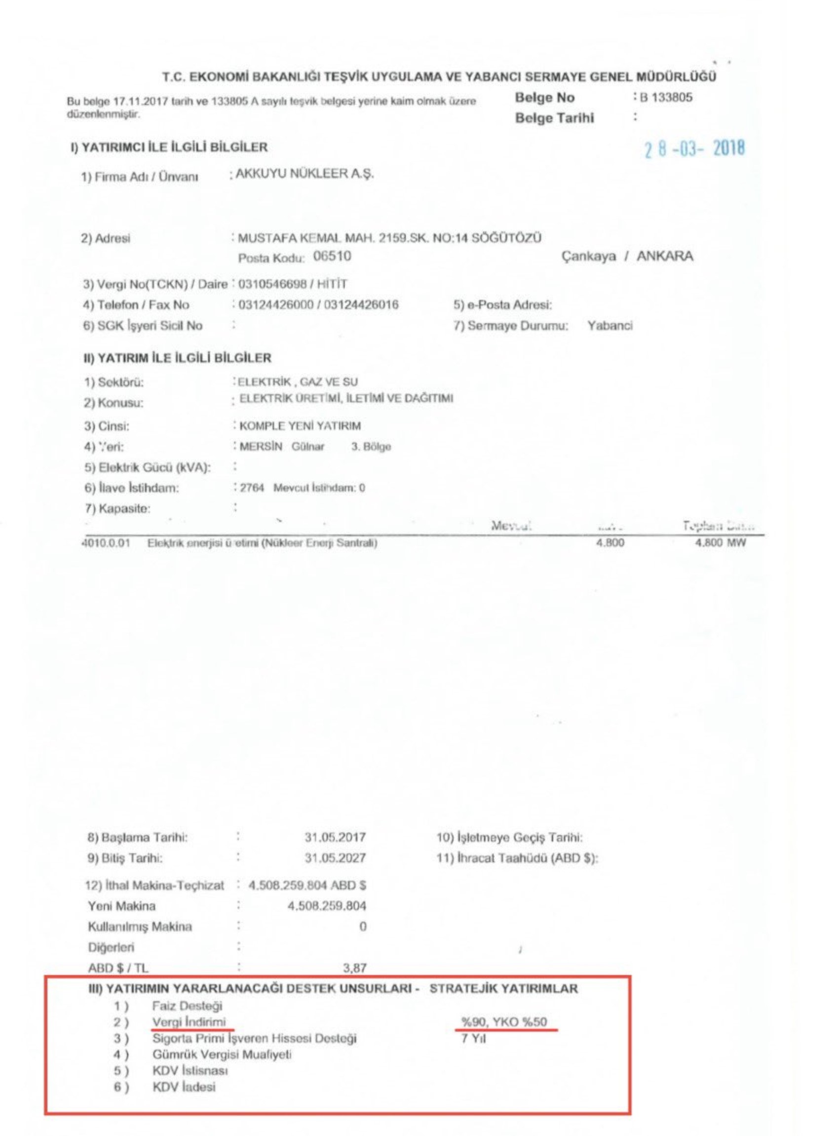 AKP’nin, Rusya’ya, Akkuyu Nükleer Güç Santrali İşinde verdiği yatırım teşviki kapsamında;