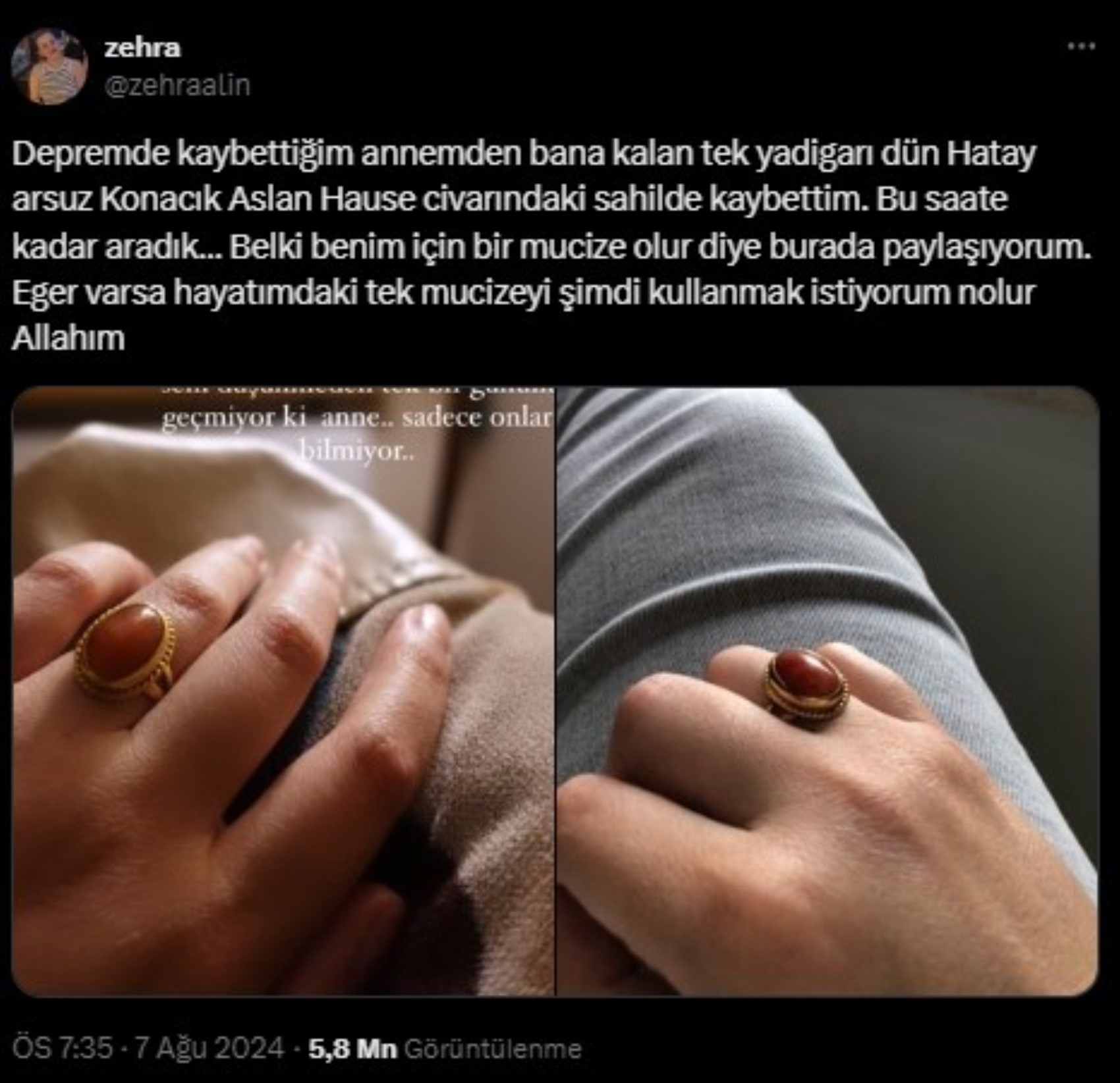 “Depremde kaybettiğim annemden bana kalan tek yadigarı dün Hatay Arsuz Konacık Aslan Hause civarındaki sahilde kaybettim. Bu saate kadar aradık… Belki benim için bir mucize olur diye burada paylaşıyorum. Eğer varsa hayatımdaki tek mucizeyi şimdi kullanmak istiyorum nolur Allahım.”