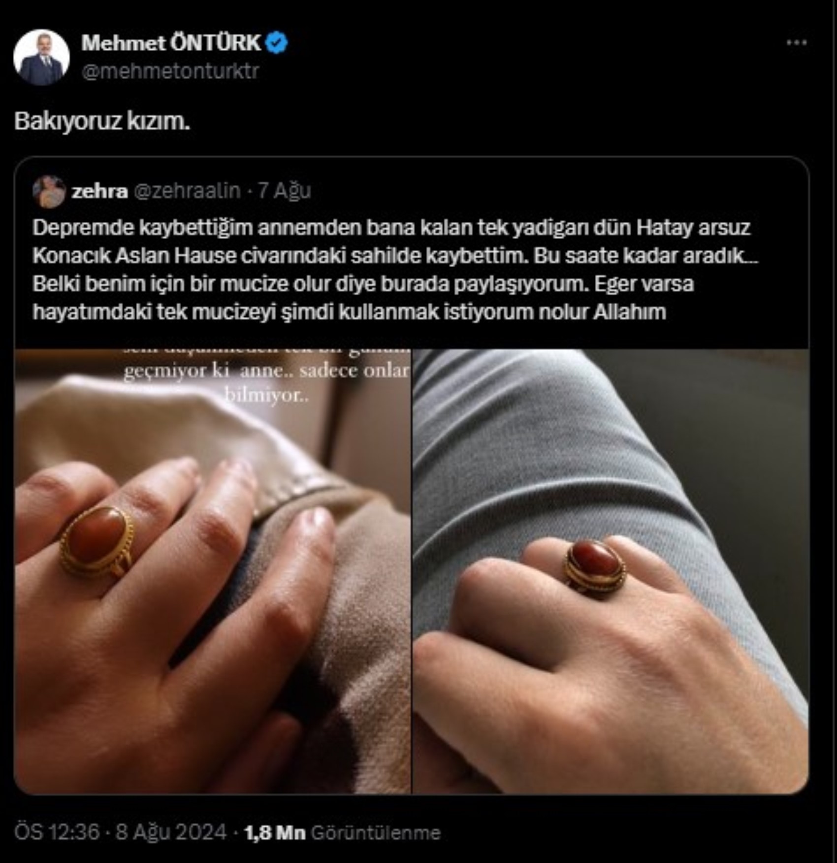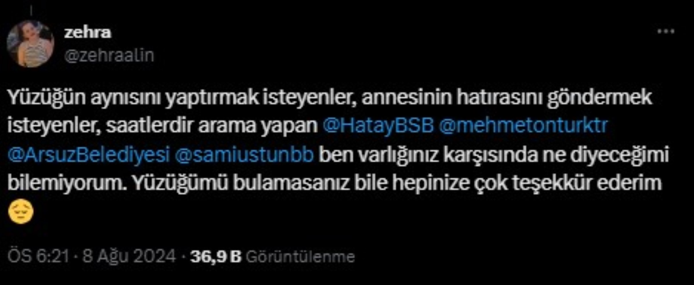Yüzüğün aynısını yaptırmak isteyenler, annesinin hatırasını göndermek isteyenler, saatlerdir arama yapan @HatayBSB @mehmetonturktr @ArsuzBelediyesi @samiustunbb ben varlığınız karşısında ne diyeceğimi bilemiyorum. Yüzüğümü bulamasanız bile hepinize çok teşekkür ederim.”