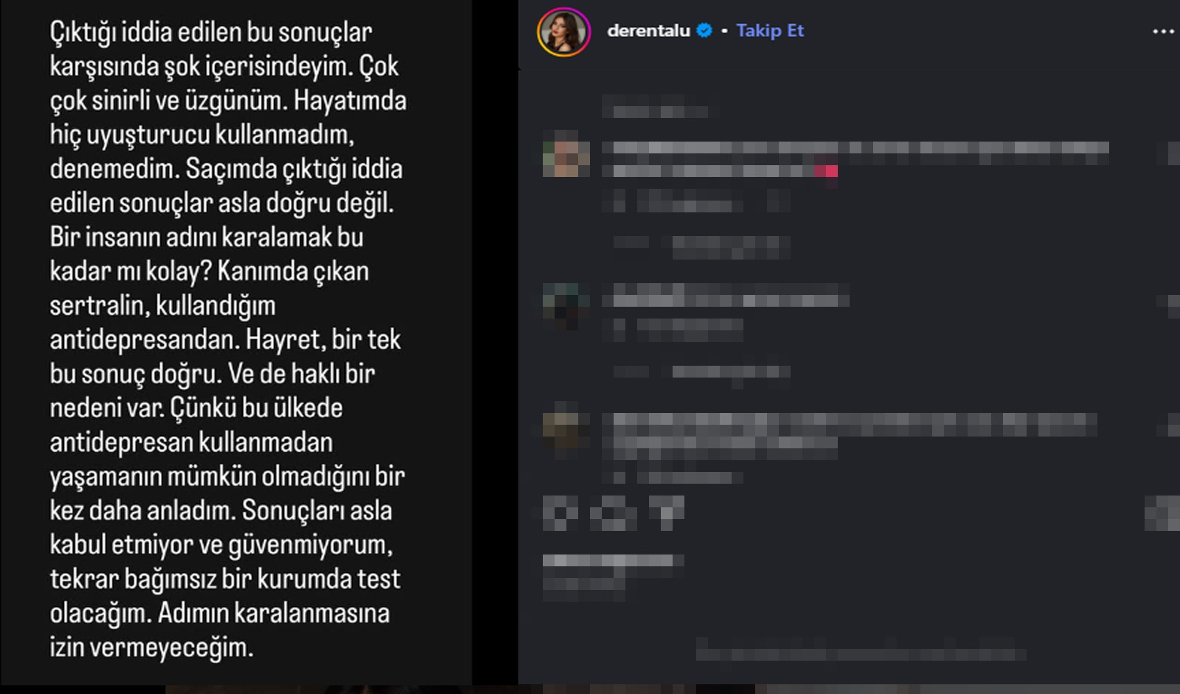 Uyuşturucu testi sonucu pozitif çıkan ünlüler arasında yer alan Deren Talu, sosyal medya hesabı üzerinden yaptığı bir açıklamayla duruma isyan etti.