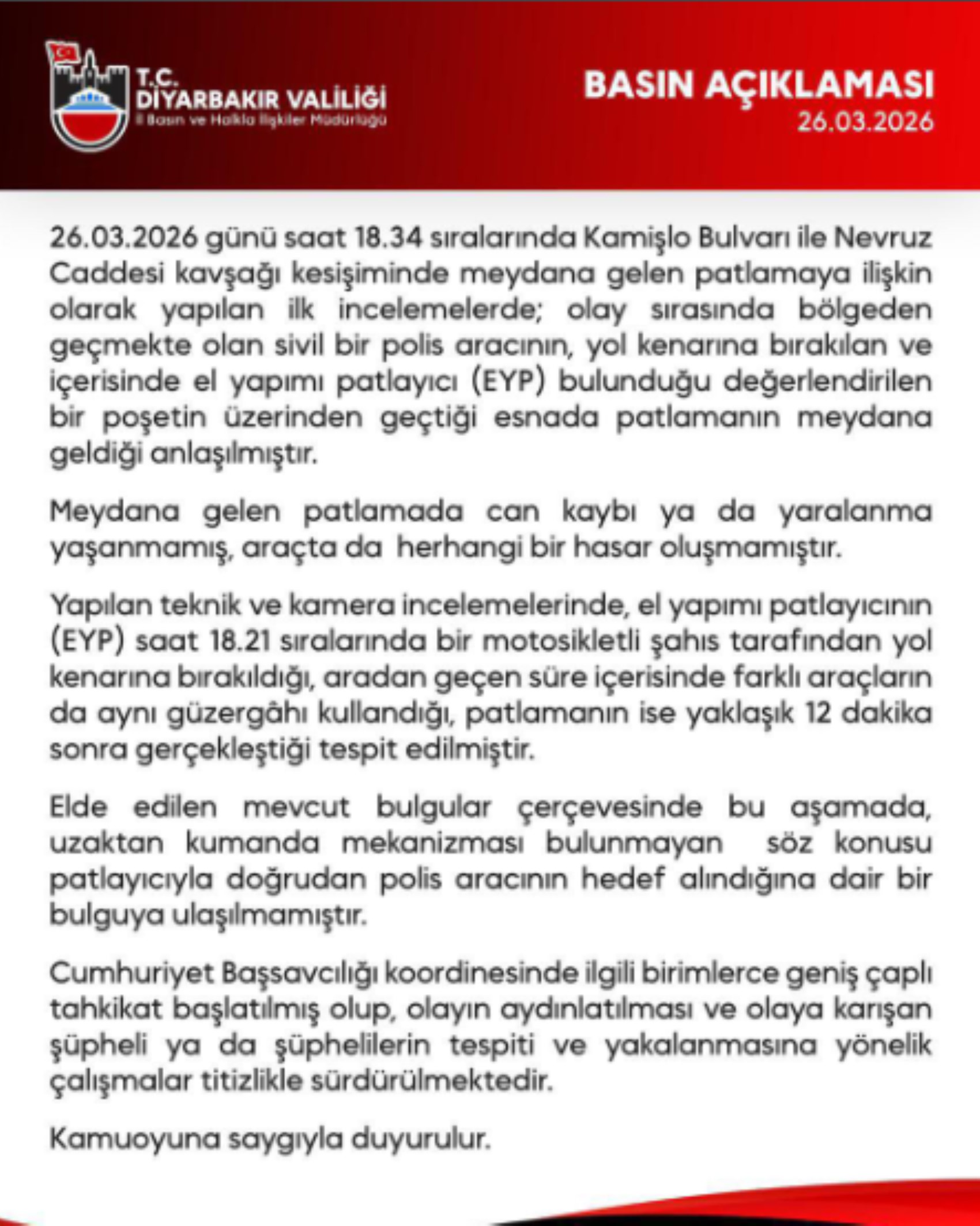 "26.03.2026 günü saat 18.34 sıralarında Kamişlo Bulvarı ile Nevruz Caddesi kavşağı kesişiminde meydana gelen patlamaya ilişkin olarak yapılan ilk incelemede; olay sırasında bölgeden geçmekte olan sivil bir polis aracının, yol kenarına bırakılan ve içerisinde el yapımı patlayıcı (EYP) bulunduğu değerlendirilen bir poşetin üzerinden geçtiği esnada patlamanın meydana geldiği anlaşılmıştır. Meydana gelen patlamada can kaybı ya da yaralanma yaşanmamış, araçta da herhangi bir hasar oluşmamıştır. Yapılan teknik ve kamera incelemelerinde, el yapımı patlayıcının (EYP) saat 18.21 sıralarında bir motosikletli şahıs tarafından yol kenarına bırakıldığı, aradan geçen süre içerisinde farklı araçların da aynı güzergâhı kullandığı, patlamanın ise yaklaşık 12 dakika sonra gerçekleştiği tespit edilmiştir. Elde edilen mevcut bulgular çerçevesinde bu aşamada, uzaktan kumanda mekanizması bulunmayan söz konusu patlayıcıyla doğrudan polis aracının hedef alındığına dair bir bulguya ulaşılmamıştır. Cumhuriyet Başsavcılığı koordinesinde ilgili birimlerce geniş çaplı tahkikat başlatılmış olup, olayın aydınlatılması ve olaya karışan şüpheli ya da şüphelilerin tespiti ve yakalanmasına yönelik çalışmalar titizlikle sürdürülmektedir. Kamuoyuna saygıyla duyurulur."