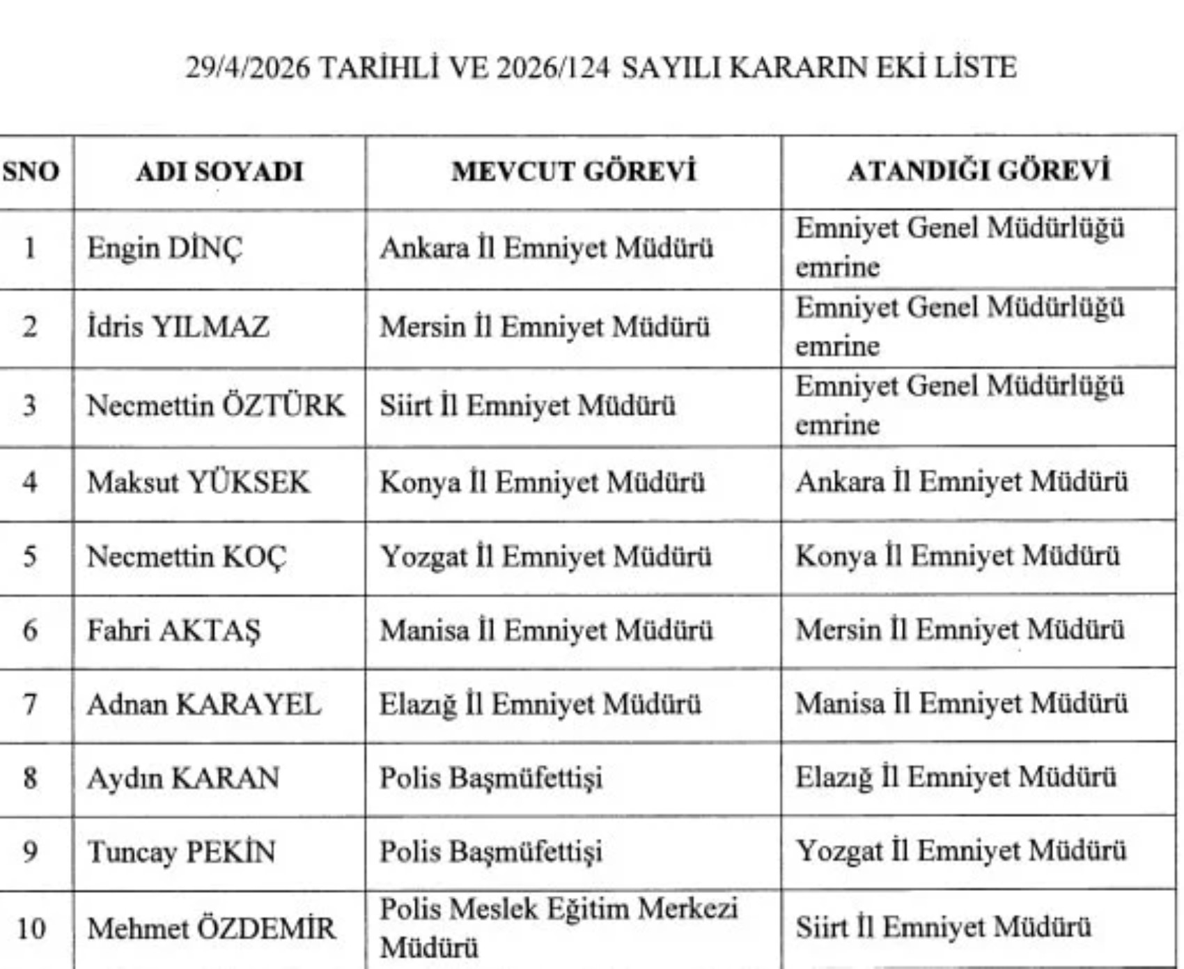 Ankara İl Emniyet Müdürü Engin Dinç, Mersin İl Emniyet Müdürü İdris Yılmaz ve Siirt İl Emniyet Müdürü Necmettin Öztürk, Emniyet Genel Müdürlüğü emrine verildi.