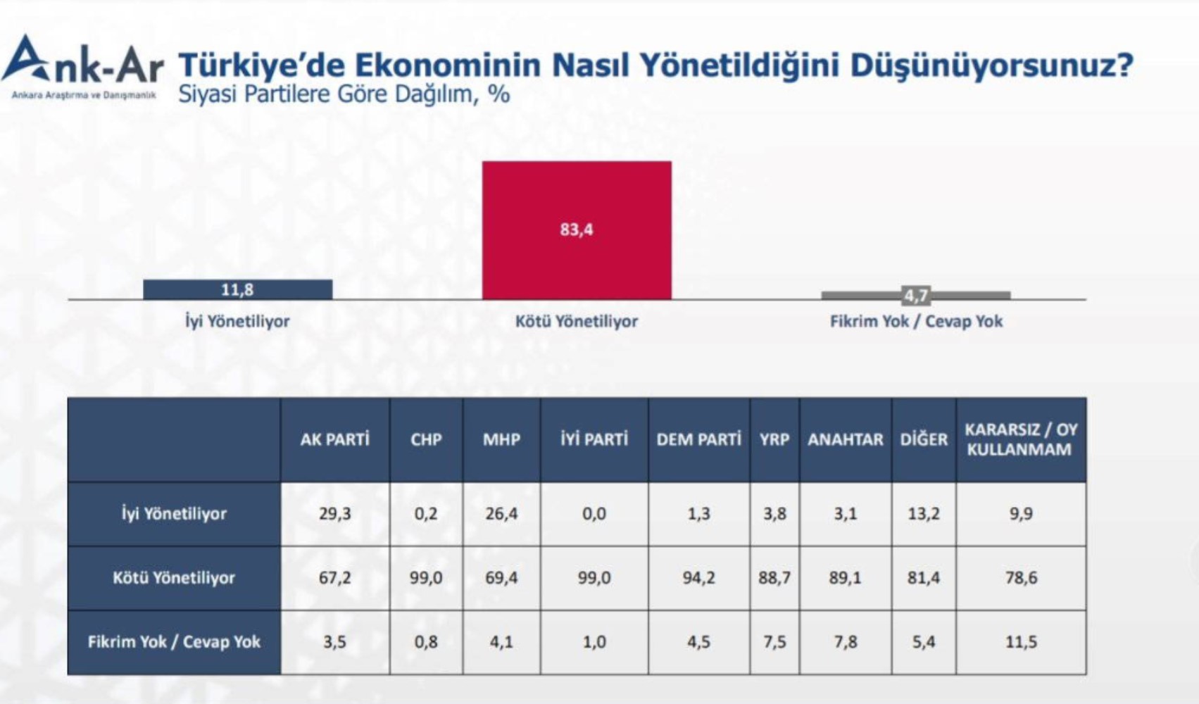 Buna göre AKP'li olan katılımcıların yüzde 67.2'si, MHP'li seçmenin ise yüzde 69.4'ü ekonominin kötü yönetildiğini düşündüğünü aktardı.