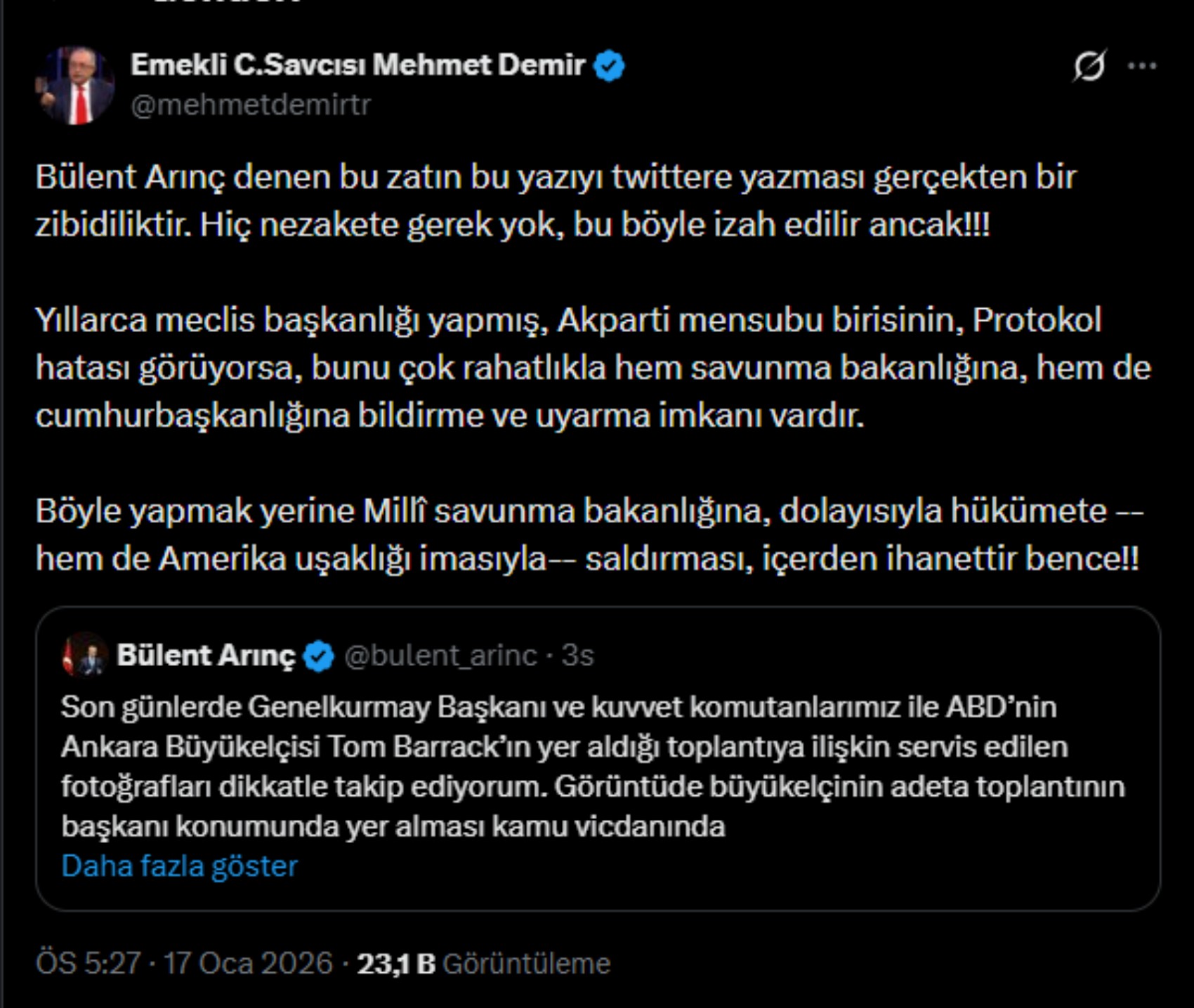 Sosyal medya hesabından yaptığı çıkışlar ve kullandığı tepki çeken ifadelerle öne çıkan Emekli C. Savcısı Mehmet Demir, Bülent Arınç'ın MSB ve Barrack paylaşımına sert tepki gösterdi.
