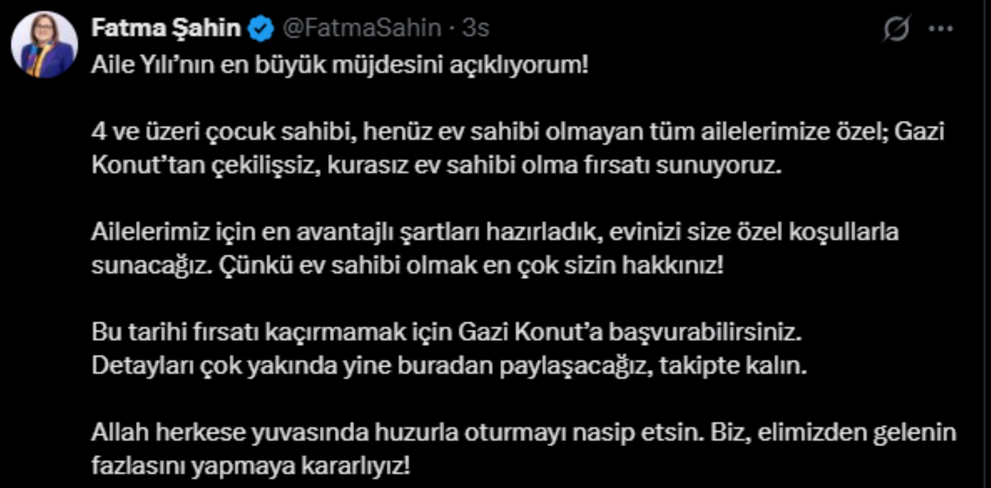Gaziantep Büyükşehir Belediyesi iştiraki olan Gazi Konut projesiyle ilgili bir duyuruda bulunan Fatma Şahin, Aile Yılı'yla ilgili olarak bir müjde verdiğini açıkladı ve şu paylaşımı yaptı: