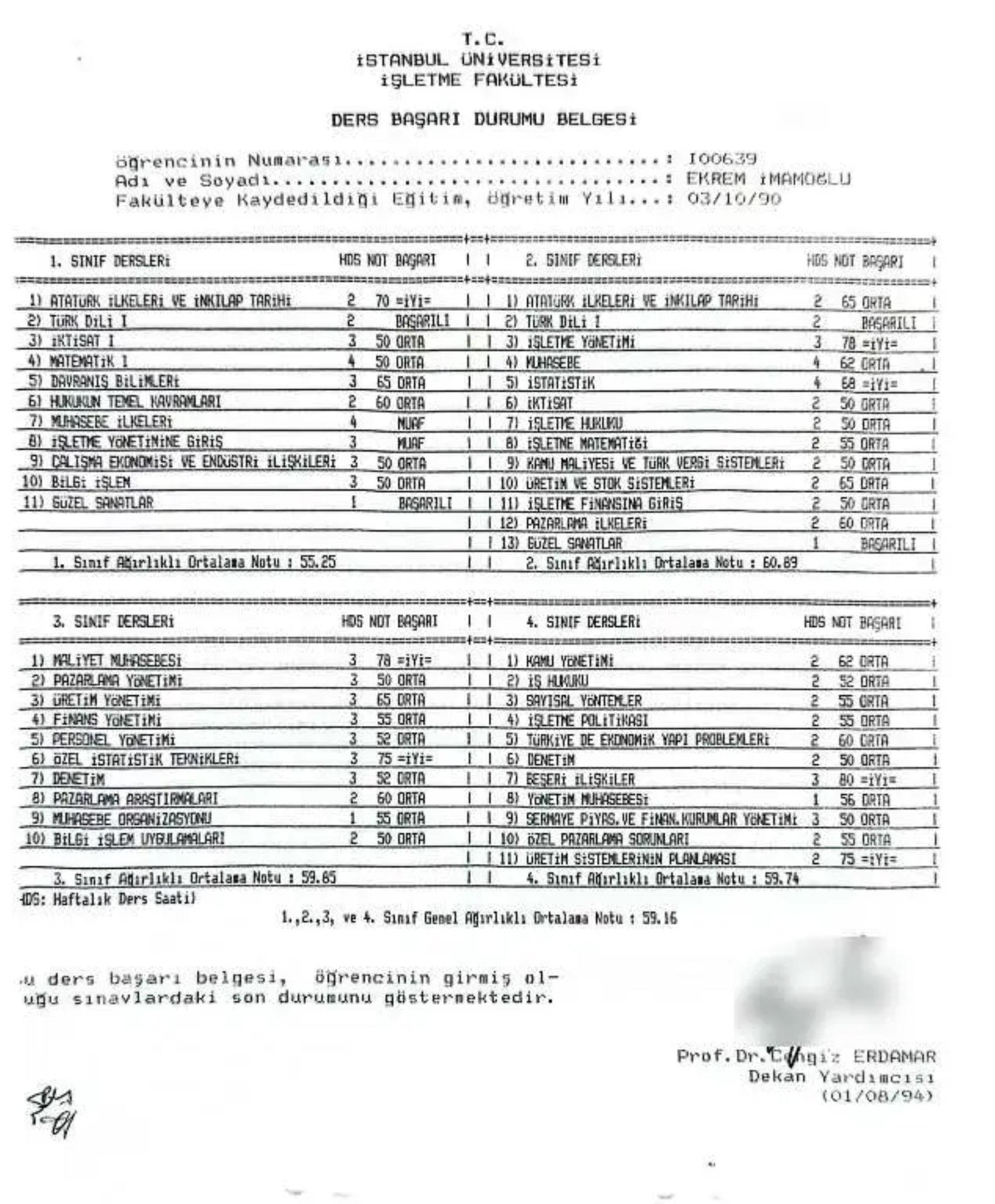 İşletme Fakültesi tarafından düzenlenen ve 1 Ağustos 1994 tarihini taşıyan “Ders Başarı Durumu Belgesi”ne göre, 100639 numaralı öğrenci Ekrem İmamoğlu, 18 Temmuz 1994’te İşletme Fakültesi İngilizce Programı’ndan mezun oldu. Transkriptte, 1. sınıftan 4. sınıfa kadar genel ağırlıklı not ortalaması 59,16 olarak yer aldı.