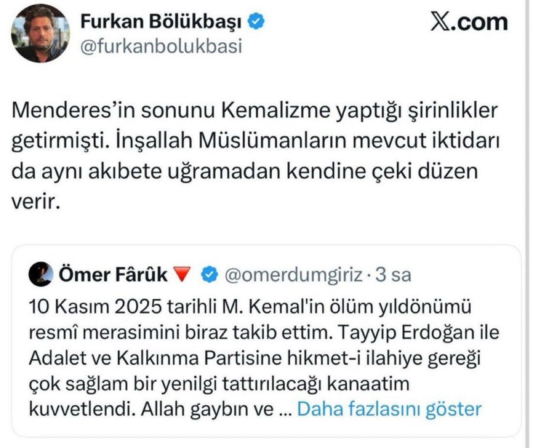 Ömer Faruk isimli sosyal medya kullanıcısının, "10 Kasım 2025 tarihli M.Kemal'in ölüm yıldönümü resmi merasimini biraz takip ettim. Tayyip Erdoğan ile Adalet ve Kalkınma Partisine hikmet-i ilahiye gereği çok sağlam bir yenilgi tattırılacağı kanaatim kuvvetlendi..." şeklindeki paylaşımına cevap veren Bölükbaşı, şu ifadeleri kullandı:
