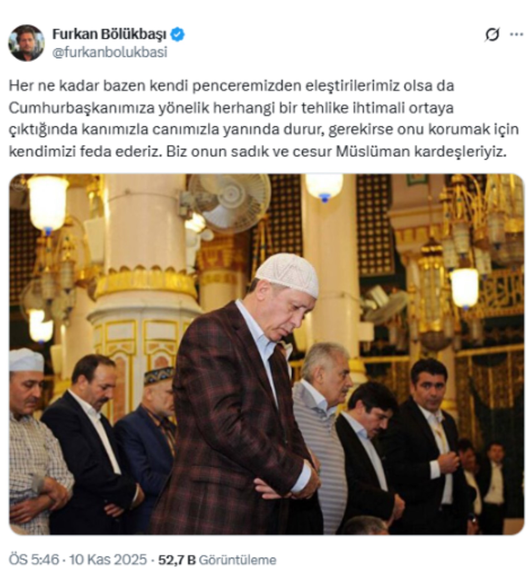 Bölükbaşı, yeni paylaşımında Erdoğan'ın namaz kıldığı bir fotoğrafı paylaşarak, "Her ne kadar bazen kendi penceremizden eleştirilerimiz olsa da Cumhurbaşkanımıza yönelik herhangi bir tehlike ihtimali ortaya çıktığında kanımızla canımızla yanında durur, gerekirse onu korumak için kendimizi feda ederiz. Biz onun sadık ve cesur Müslüman kardeşleriyiz" ifadelerini kullandı.