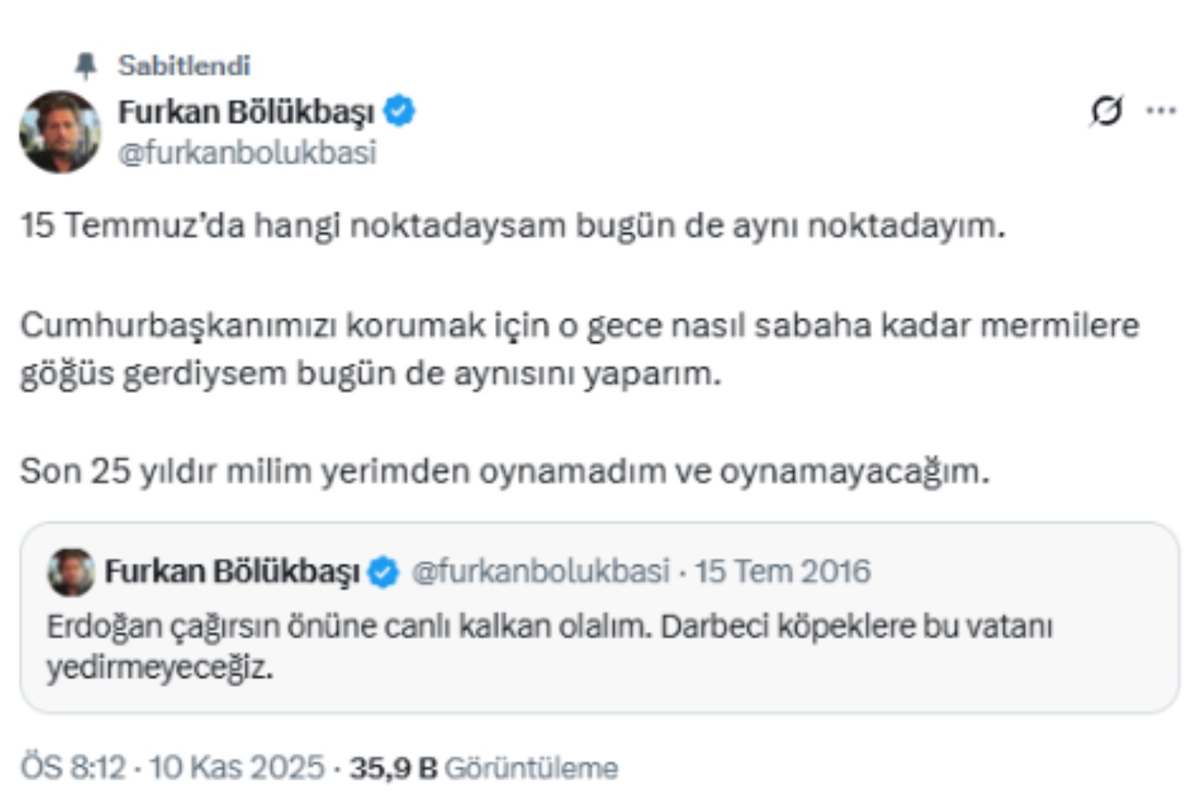 Ardından ise 15 Temmuz 2016'da yaptığı bir paylaşımı alıntıladığı paylaşımı profiline sabitledi. O paylaşımda ise, "15 Temmuz’da hangi noktadaysam bugün de aynı noktadayım. Cumhurbaşkanımızı korumak için o gece nasıl sabaha kadar mermilere göğüs gerdiysem bugün de aynısını yaparım. Son 25 yıldır milim yerimden oynamadım ve oynamayacağım" ifadelerini kullanması dikkat çekti.