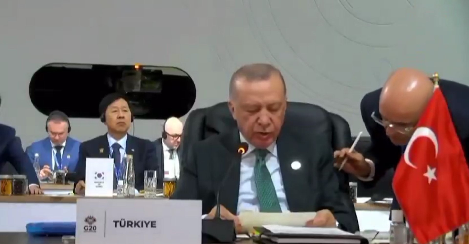 Güney Afrika’nın Johannesburg kentinde düzenlenen G20 Liderler Zirvesi'ne katılan Cumhurbaşkanı Erdoğan, konuşmasına başlamadan önce, Maliye Bakanı Mehmet Şimşek'in dikkat çeken bir uyarısıyla karşılaştı.