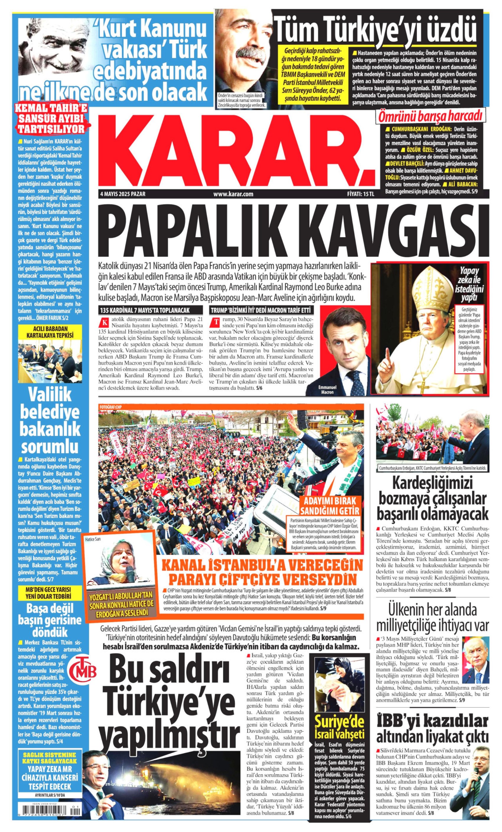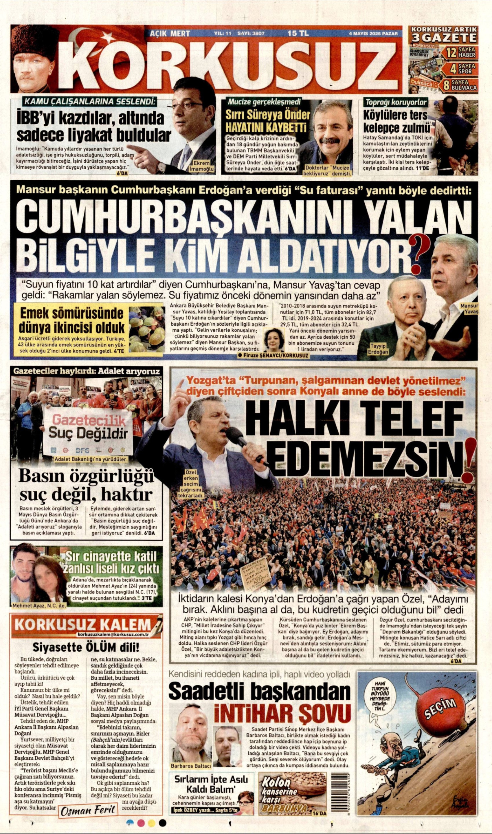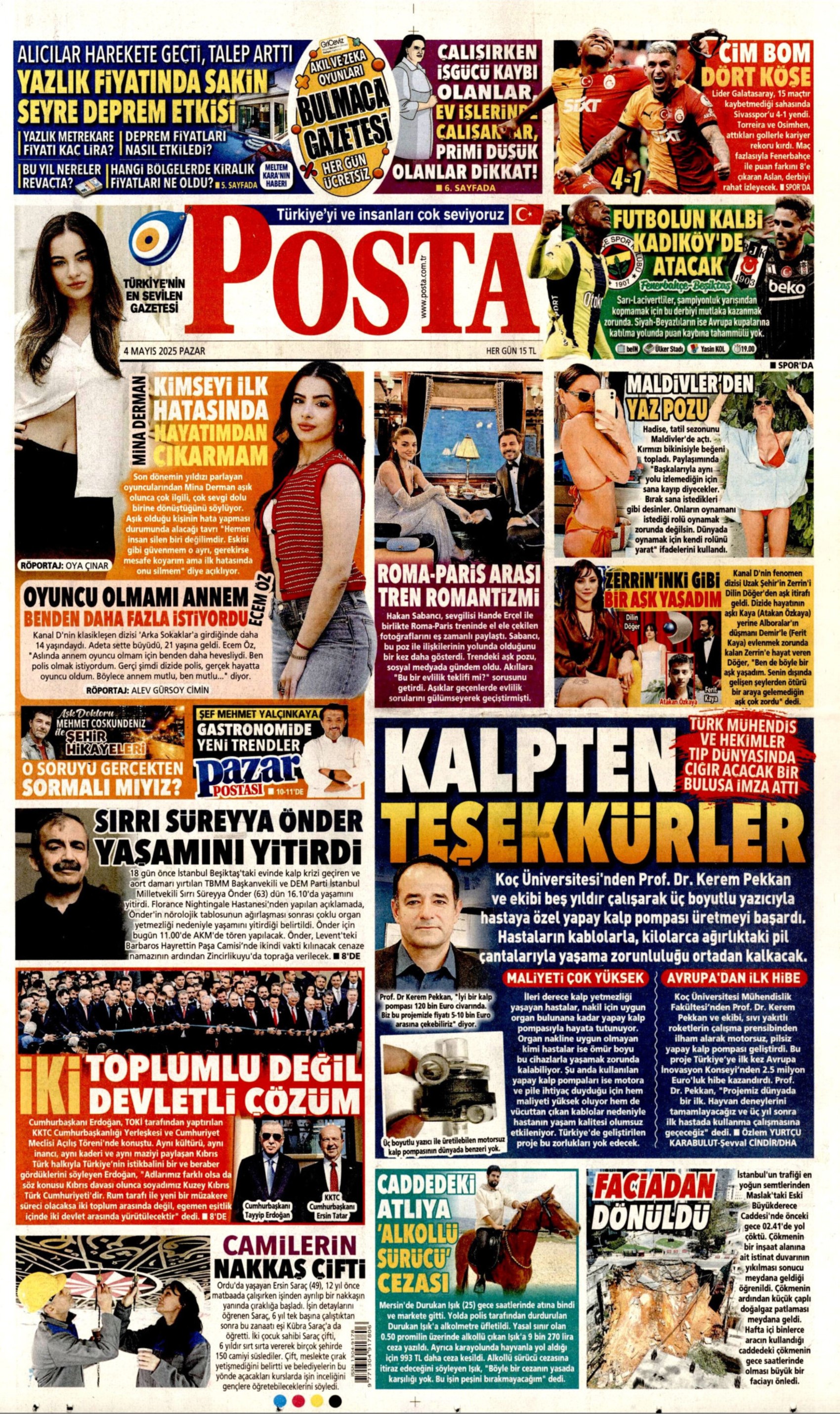 4 Mayıs 2025 tarihine ait ulusal gazete manşetlerini 12punto'dan takip edebilir, gazetelerin birinci sayfalarını ve haber başlıklarını okuyabilirsiniz. 15 Nisan'da geçirdiği kalp krizinin ardından hastaneye kaldırılıp 12 saat süren operasyon geçiren DEM Partili Sırrı Süreyya Önder, dün saat 16.10 sıralarında hayatını kaybetti. Önder'in ölüm haberi gazetelerde yer buldu. Peki, hangi gazete hangi başlığı attı? İşte 4 Mayıs 2025 tarihli gazete manşetleri...