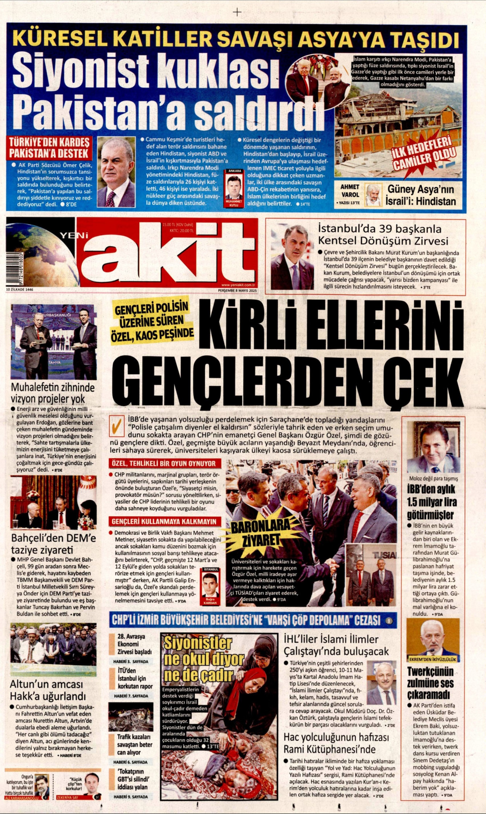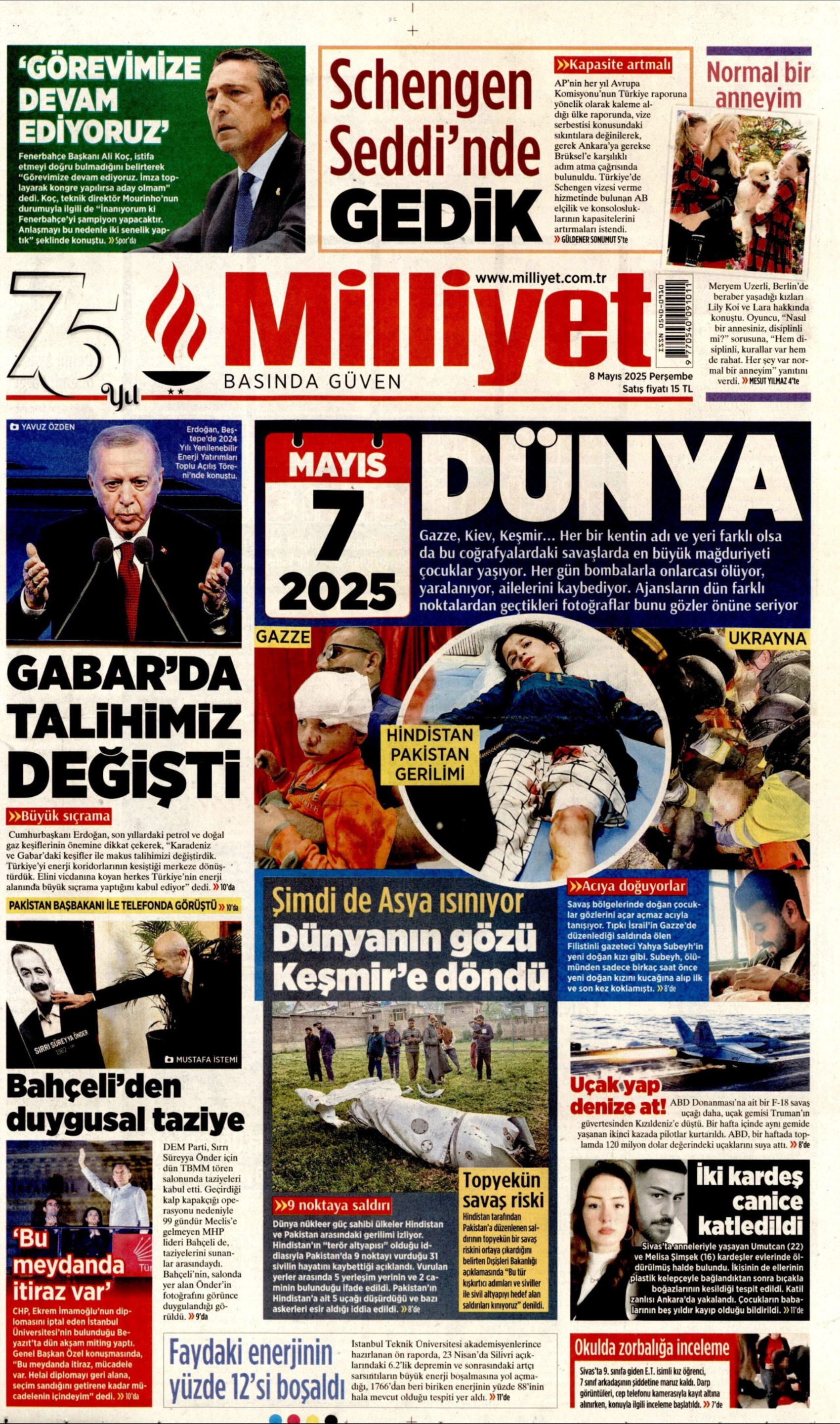 8 Mayıs 2025 tarihine ait ulusal gazete manşetlerini 12punto'dan takip edebilir, gazetelerin birinci sayfalarını ve haber başlıklarını okuyabilirsiniz. MHP lideri Devlet Bahçeli, 3 ay sonra ilk kez TBMM'ye geldi. DEM Parti'ye taziye ziyaretinde bulunan Bahçeli'nin, Sırrı Söreyya Önder'in fotoğrafını okşadığı anlar dikkat çekti. CHP ise, Beyazıt Meydanı'nda tarihi bir miting gerçekleştirdi. Peki, hangi gazete hangi başlığı attı? İşte 8 Mayıs 2025 tarihli gazete manşetleri...