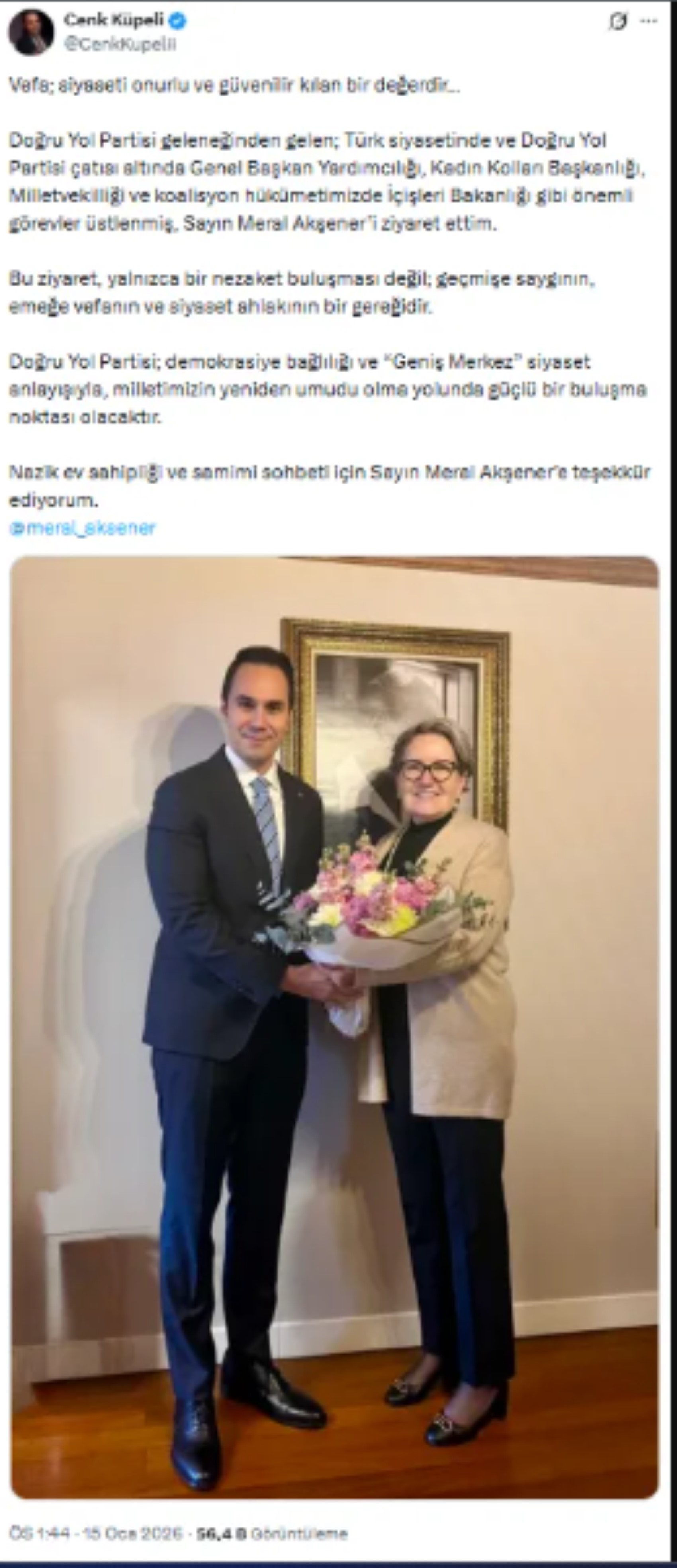 Akşener'e çiçek demeti takdim ederken yan yana çekilmiş fotoğrafı da paylaşan Cenk Küpeli, şu ifadeleri kullandı: