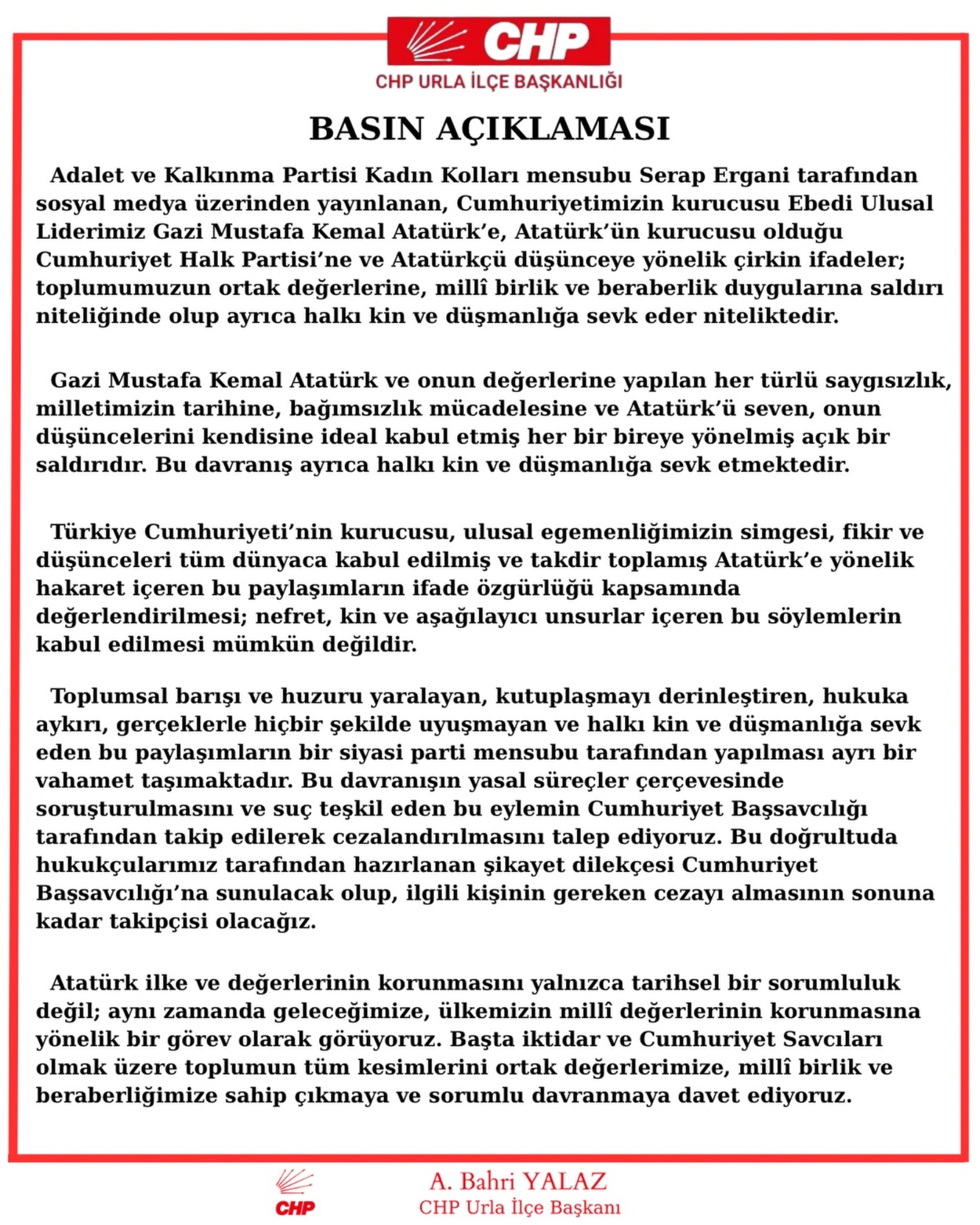“Adalet ve Kalkınma Partisi Kadın Kolları mensubu Serap Ergani tarafından sosyal medya üzerinden yayınlanan, Cumhuriyetimizin kurucusu Ebedi Ulusal Liderimiz Gazi Mustafa Kemal Atatürk’e, Atatürk’ün kurucusu olduğu Cumhuriyet Halk Partisi’ne ve Atatürkçü düşünceye yönelik çirkin ifadeler; toplumumuzun ortak değerlerine, millî birlik ve beraberlik duygularına saldırı niteliğinde olup ayrıca halkı kin ve düşmanlığa sevk eder niteliktedir.