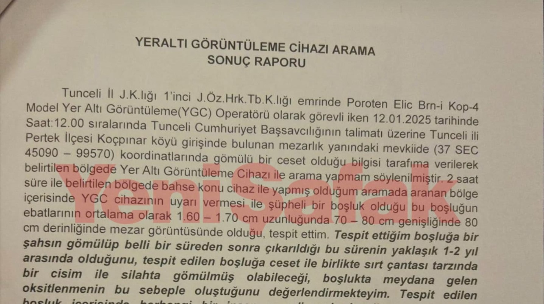 “Tunceli ili Pertek İlçesi Koçpınar köyü girişinde bulunan mezarlık yanındaki mevkide (37 SEC 45090 – 99570) koordinatlarında gömülü bir ceset olduğu bilgisi tarafıma verilerek belirtilen bölgede Yer Altı Görüntüleme Cihazı ile arama yapmam söylenilmiştir. 2 saat süre ile belirtilen bölgede bahse konu cihaz ile yapmış olduğum aramada aranan bölge içerisinde YGC cihazının uyarı vermesi ile şüpheli bir boşluk olduğu bu boşluğun ebatlarının ortalama olarak 1.60 – 1.70 cm uzunluğunda 70 – 80 cm genişliğinde 80 cm derinliğinde mezar görüntüsünde olduğu, tespit ettim.