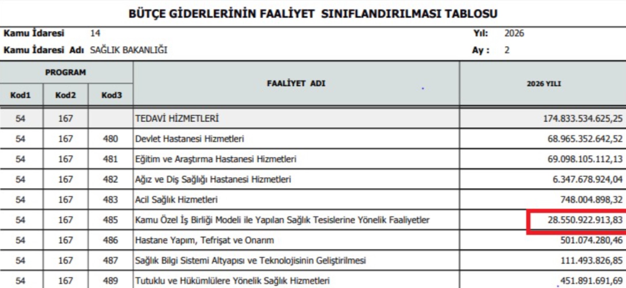 T.C. Sağlık Bakanlığı’nın 2026 yılı bütçe giderlerinin faaliyet sınıflandırmasına ilişkin tablosuna göre, yılın ilk iki ayında “Kamu Özel İş Birliği Modeli ile Yapılan Sağlık Tesislerine Yönelik Faaliyetler” kaleminden 28 milyar 550 milyon lira ödeme yapıldı. Bu kalem, Türkiye genelinde faaliyet gösteren 18 şehir hastanesine yapılan kira ve hizmet bedeli ödemelerini kapsıyor.