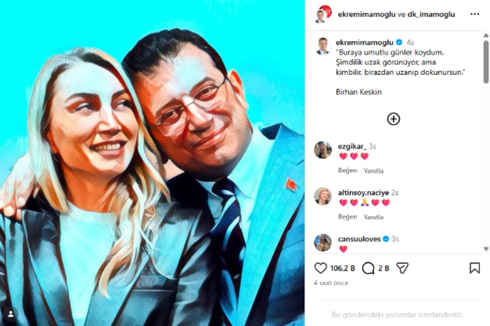 İstanbul Cumhuriyet Başsavcılığı tarafından yürütülen soruşturma kapsamında tutuklanan İstanbul Büyükşehir Belediye (İBB) Başkanı ve CHP'nin Cumhurbaşkanı adayı Ekrem İmamoğlu, 14 Şubat Sevgililer Günü dolayısıyla sosyal medya Instagram hesabından eşi Dilek İmamoğlu'nun sevgililer gününü kutladı.