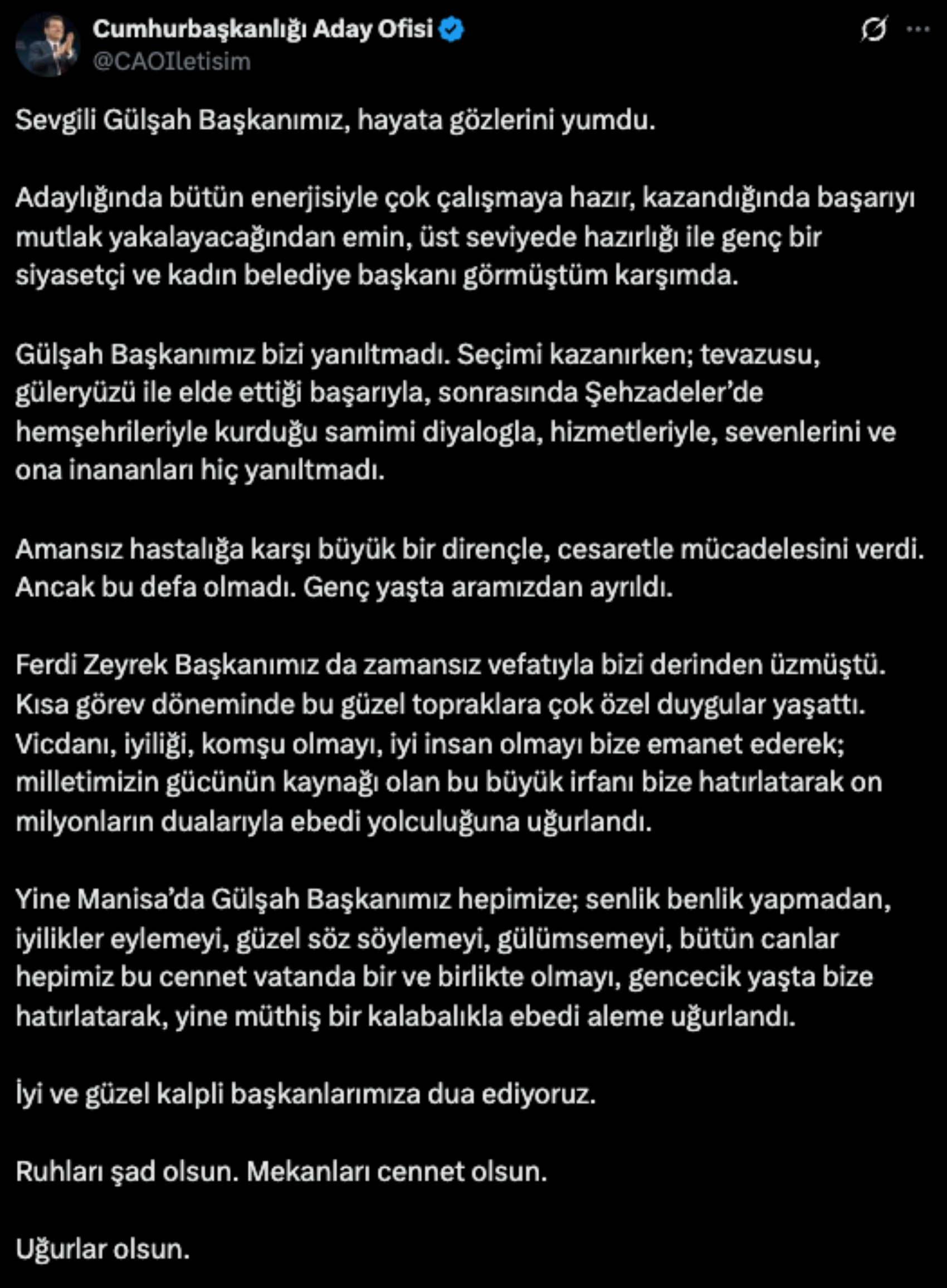 Ekrem İmamoğlu, hayatını kaybeden Manisa Şehzadeler Belediye Başkanı Gülşah Durbay için duygusal bir paylaşım yaptı.