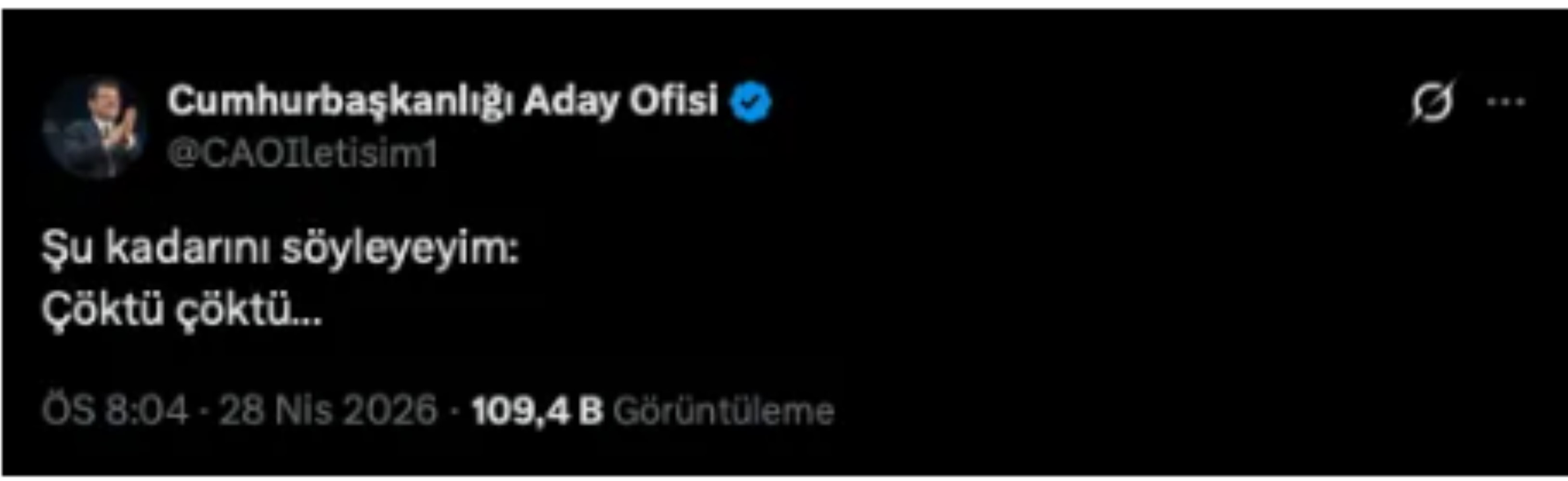 İBB Başkanı Ekrem İmamoğlu'nun seçim kampanyası kapsamında kurulan Cumhurbaşkanlığı Aday Ofisi'nin X hesabından yapılan paylaşımda "Şu kadarını söyleyeyim: Çöktü çöktü…" denildi.