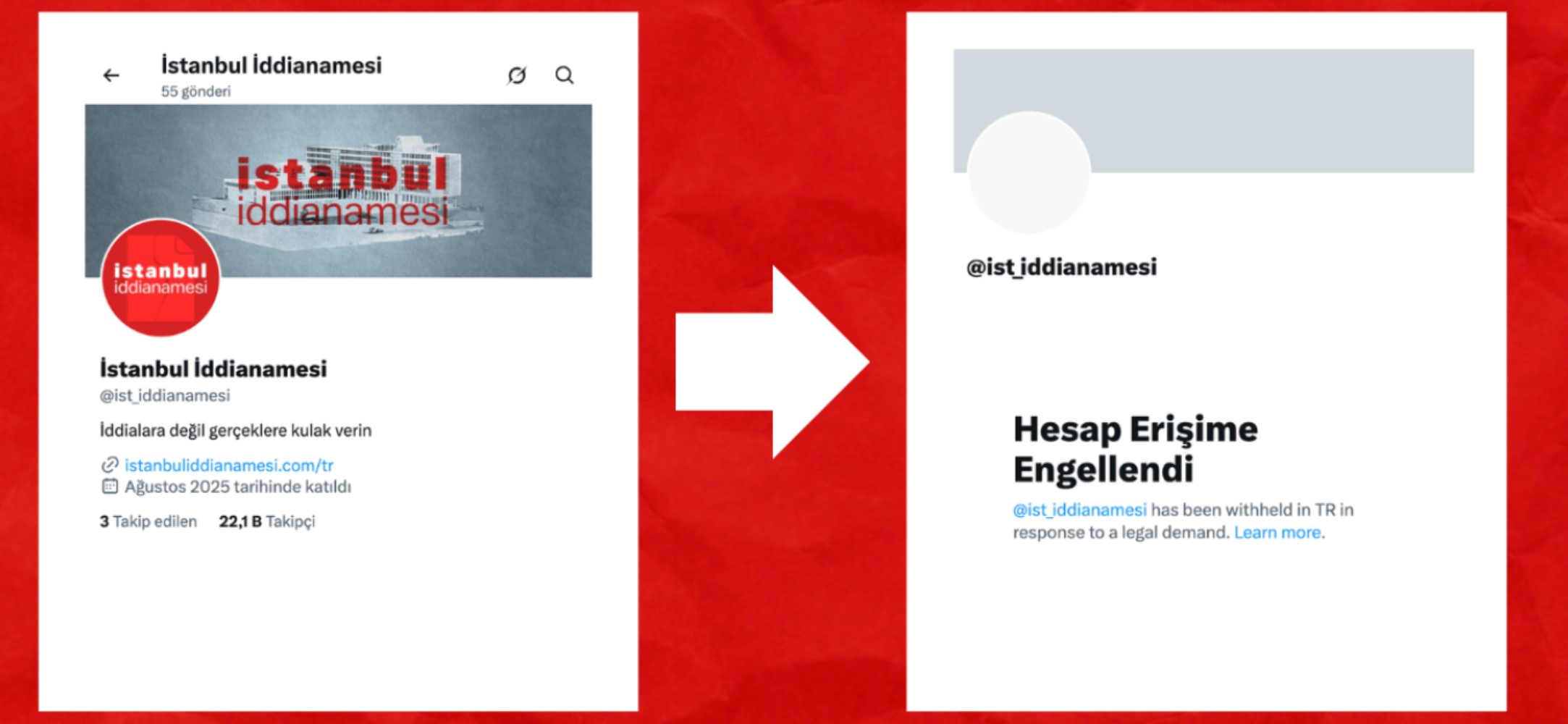Üç kez erişim engeli getirilen hesaptan sonra, bu kez “İstanbul İddianamesi” başlığıyla içerik paylaşan internet sitesi ve X hesabı için karar alındı. “istanbuliddianamesi.com/tr” adresli site ve X platformundaki “ist_iddianamesi” hesabı, İstanbul Büyükşehir Belediyesi’ne yönelik “yolsuzluk” iddiaları doğrultusunda hazırlanan iddianameye ilişkin paylaşımları nedeniyle gündemdeydi.