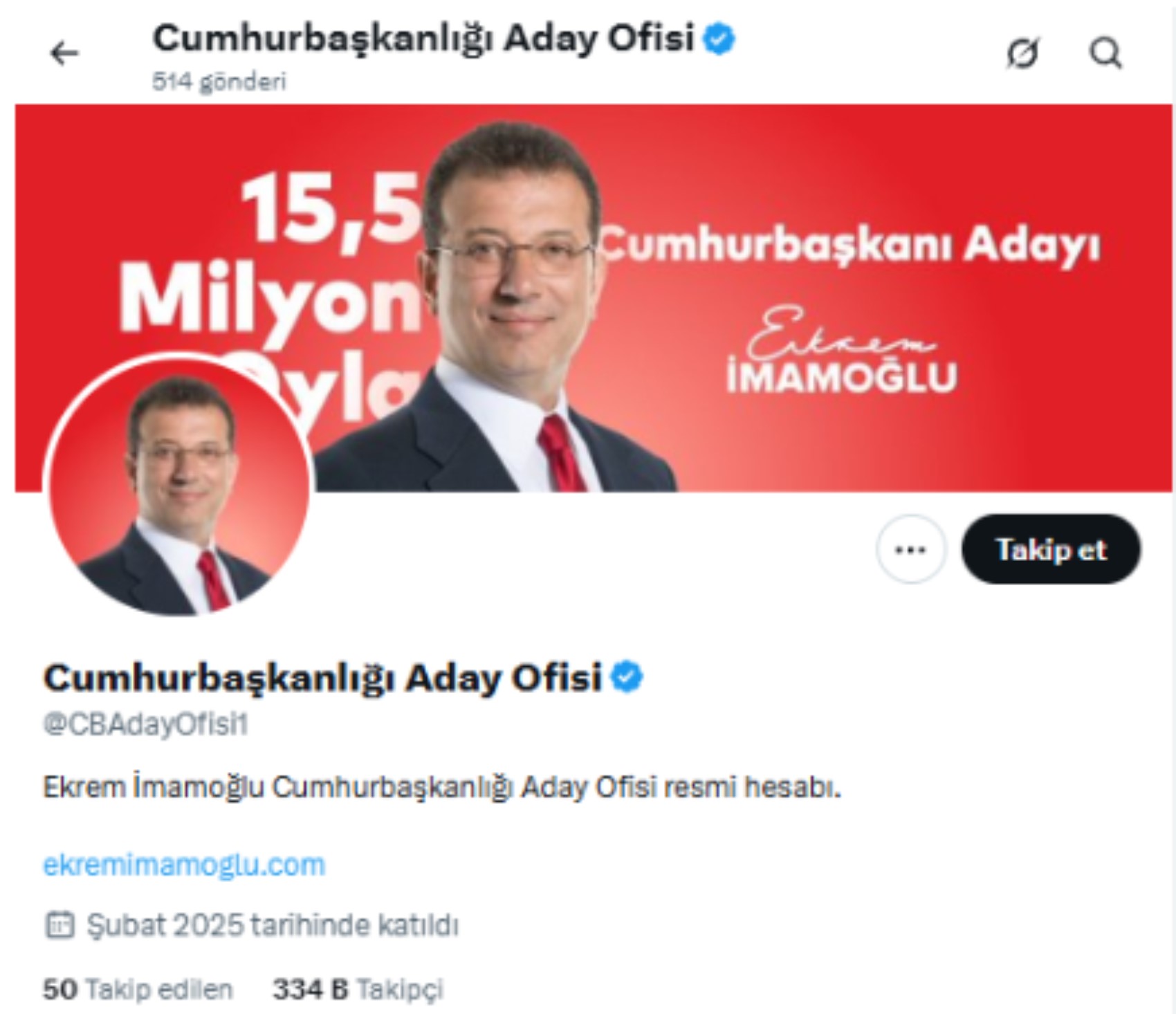 İstanbul Cumhuriyet Başsavcılığı, İBB Başkanı ve CHP'nin Cumhurbaşkanı Adayı Ekrem İmamoğlu'nun sosyal medya hesabının ardından, Cumhurbaşkanlığı çalışmalarının yürütüldüğü Cumhurbaşkanlığı Aday Ofisi isimli sosyal medya hesabına da erişim engeli getirdi.