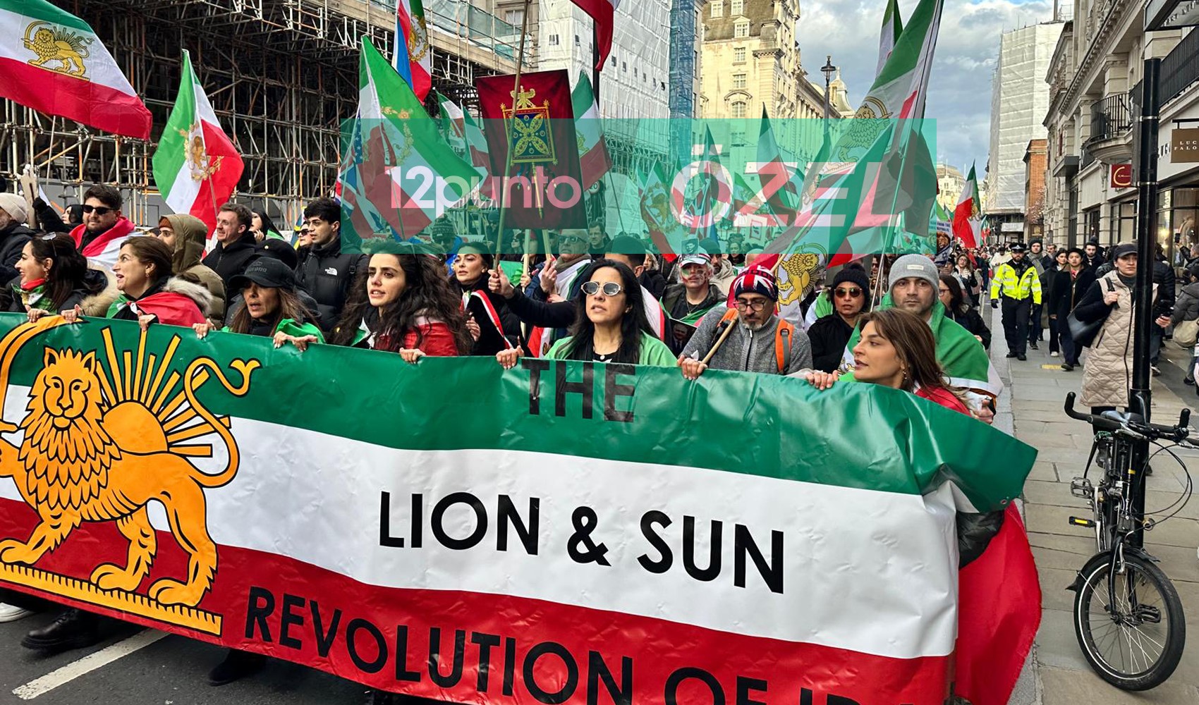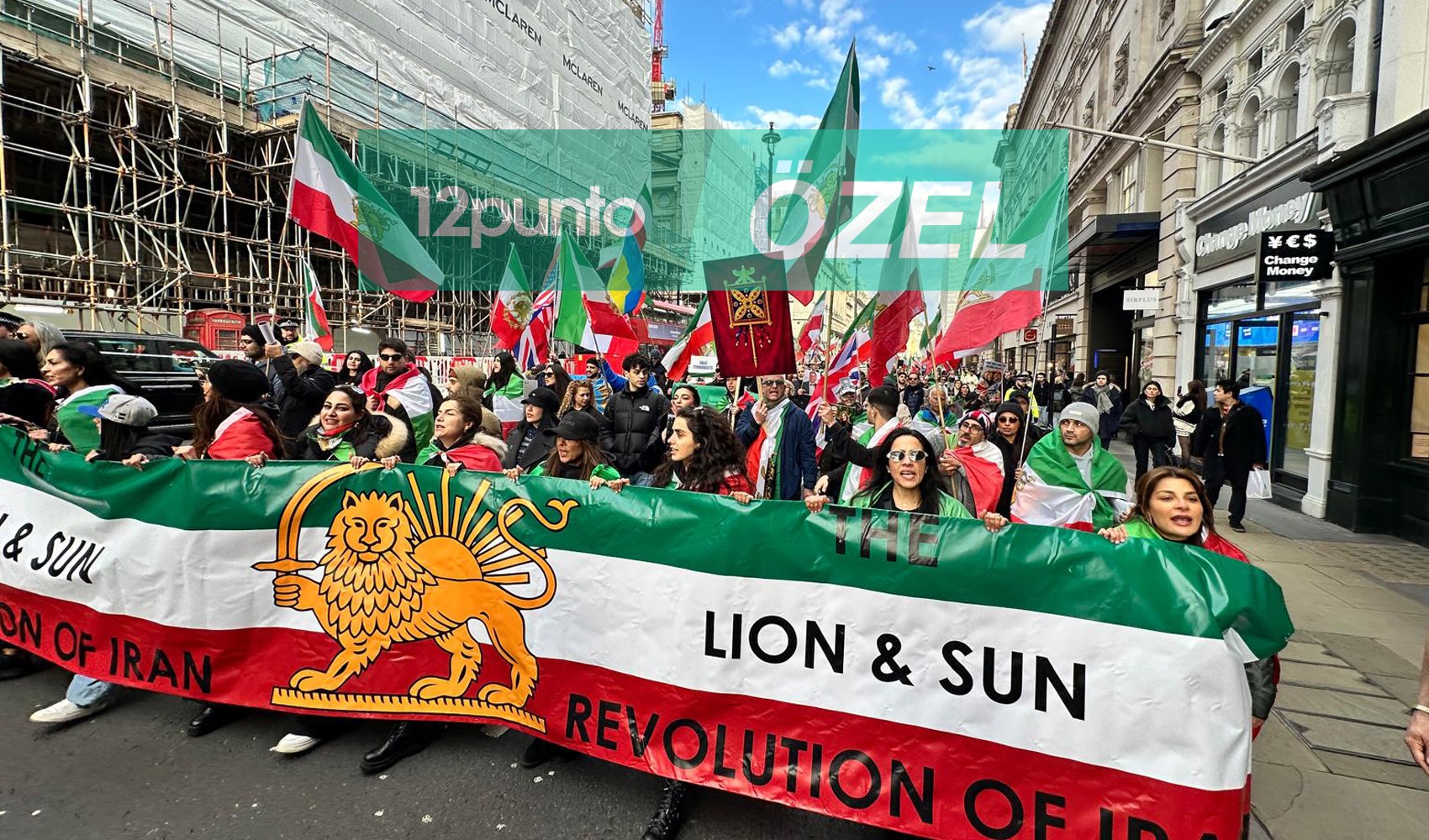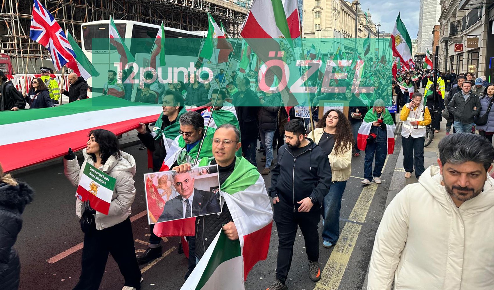 12punto Londra temsilcisi Taner Bildik'in takip ettiği yürüyüşte İranlı muhalifler açtıkları bayraklar ve attıkları sloganlarla boy gösterdi.