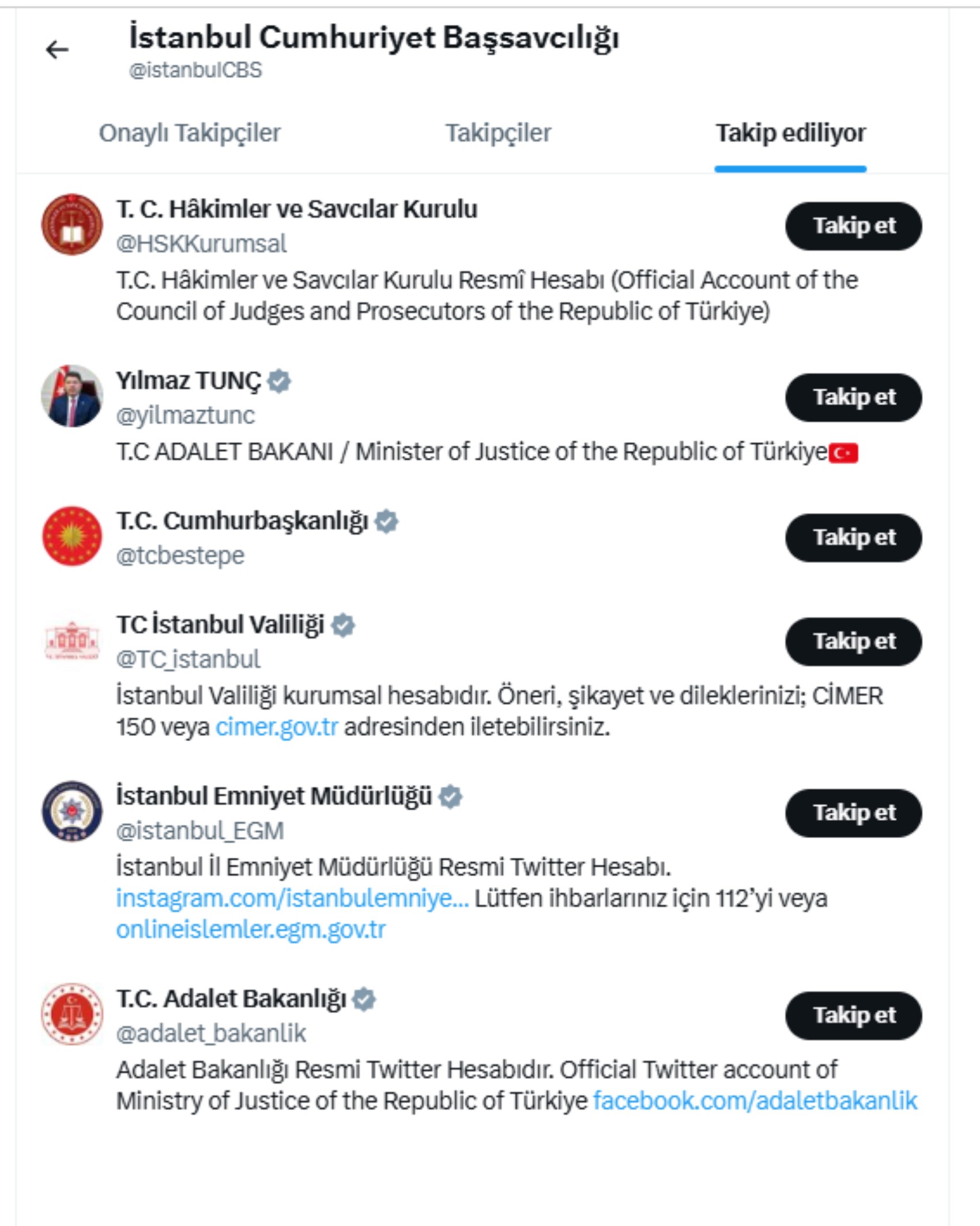 İstanbul Cumhuriyet Başsavcılığı’nın yeni açılan X hesabında şu ana kadar yalnızca 6 hesap takibe alındı. Takip edilen kurum ve isimler şu şekilde sıralandı: