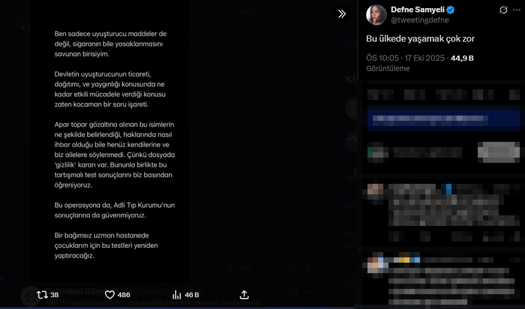 Yapılan test sonuçlarına güvenmediğini söyleyen ve hükümetin uyuşturucu politikasını da eleştiren Defne Samyeli yaptığı paylaşımda şu ifadeleri kullandı: