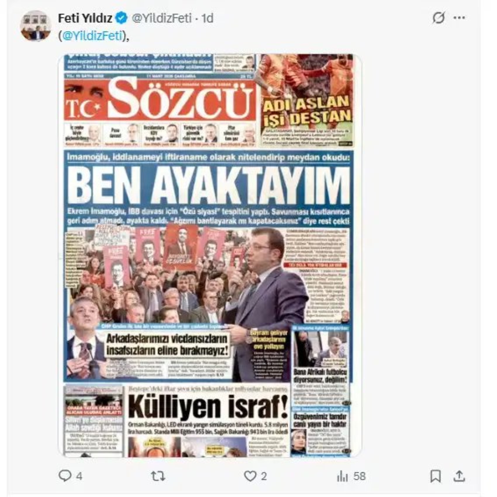 Yıldız, tutuklu cumhurbaşkanı adayı Ekrem İmamoğlu'nun yer aldığı bir gazete manşetini X hesabından paylaştı. Feti Yıldız'ın paylaşımında, Sözcü gazetesinin 11 Mart tarihindeki manşeti yer aldı.