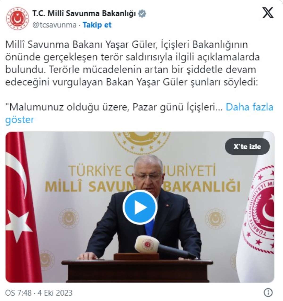 "Malumunuz olduğu üzere, Pazar günü İçişleri Bakanlığımızın önünde bir terör saldırısı oldu. Kahraman polislerimiz bu girişime anında karşılık vererek 2 teröristi de etkisiz hâle getirdi. Bu vesileyle, yaralanan kahraman polislerimize acil şifalar diliyor, tüm İçişleri Bakanlığı camiamıza geçmiş olsun dileklerimi sunuyorum. Ayrıca hain teröristlerce Kayseri’de şehit edilen Mikail Bozlağan kardeşimize Allah’tan rahmet, kederli ailesine sabır, asil milletimize başsağlığı diliyorum.