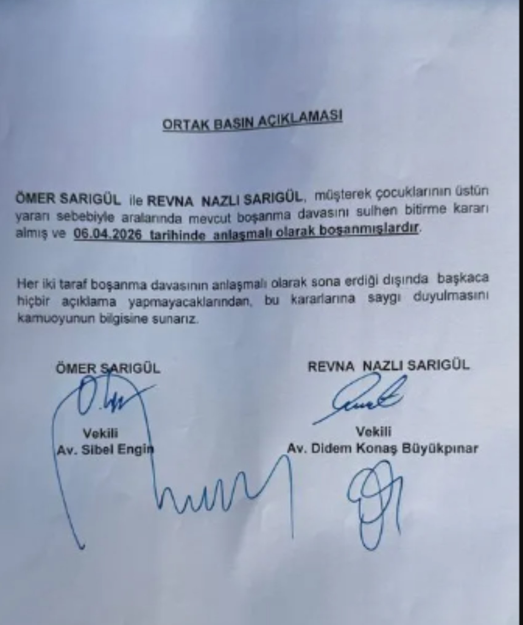 "Ömer Sarıgül ile Revna Nazlı Sarıgül, müşterek çocuklarının üstün yararı sebebiyle aralarında mevcut boşanma davasını sulhen bitirme kararı almış ve 06.04.2026 tarihinde anlaşmalı olarak boşanmışlardır.