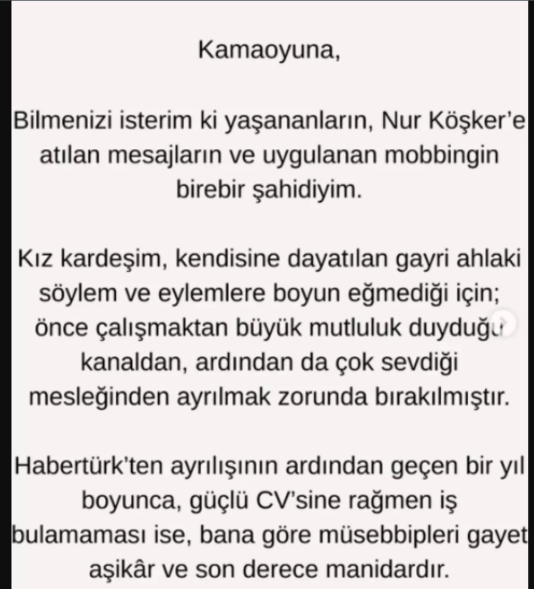 İddiayı dile getiren Nur Köşker'in ablası Yasemin Köşker de yaşananlara ilişkin açıklama yaptı. Sosyal medyadan yaptığı açıklamada abla Köşker "Bilmenizi isterim ki yaşananların, Nur Köşker'e atılan mesajların ve uygulanan mobbingin birebir şahidiyim" dedi.