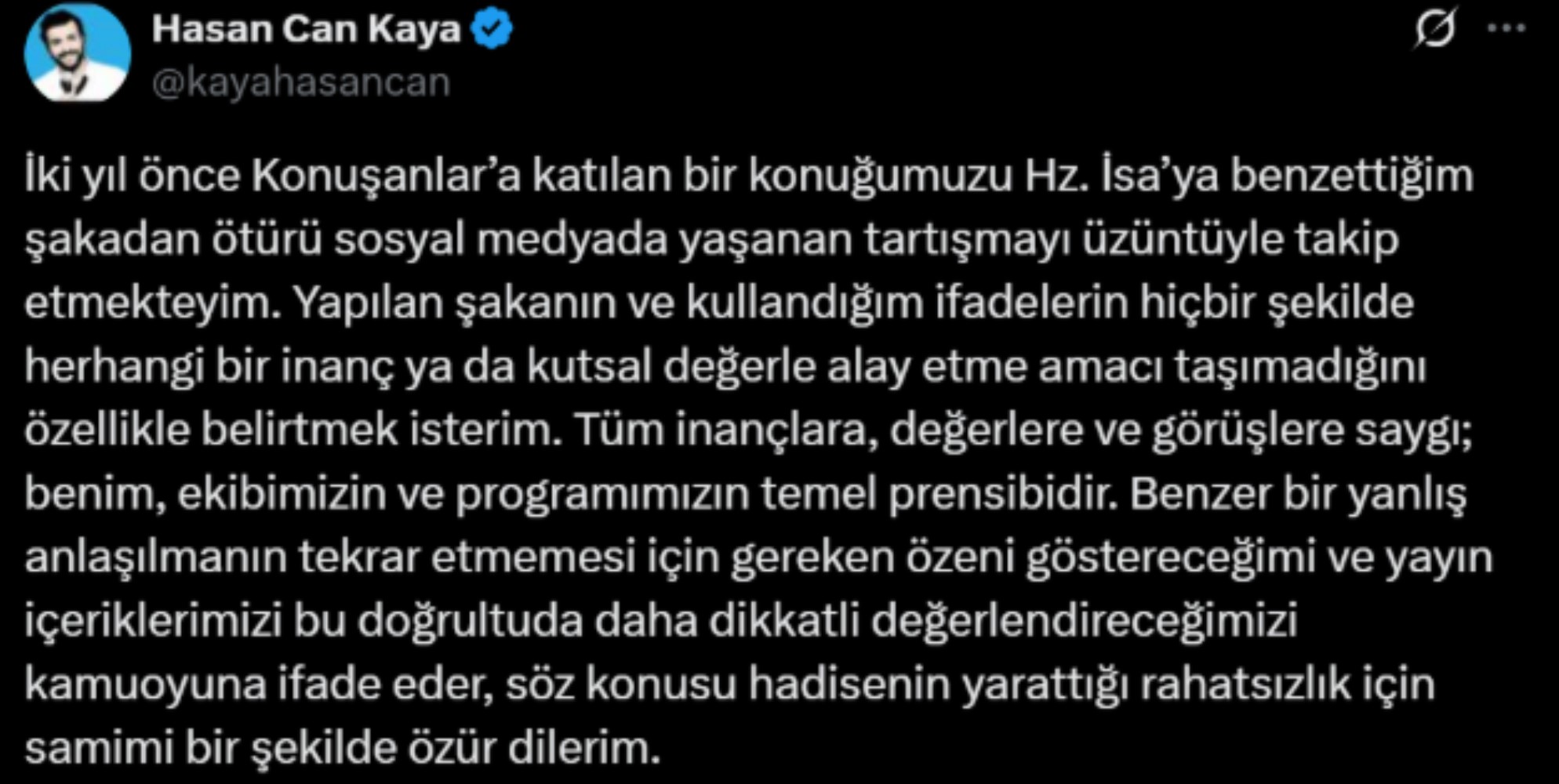 "İki yıl önce Konuşanlar’a katılan bir konuğumuzu Hz. İsa’ya benzettiğim şakadan ötürü sosyal medyada yaşanan tartışmayı üzüntüyle takip etmekteyim. Yapılan şakanın ve kullandığım ifadelerin hiçbir şekilde herhangi bir inanç ya da kutsal değerle alay etme amacı taşımadığını özellikle belirtmek isterim.