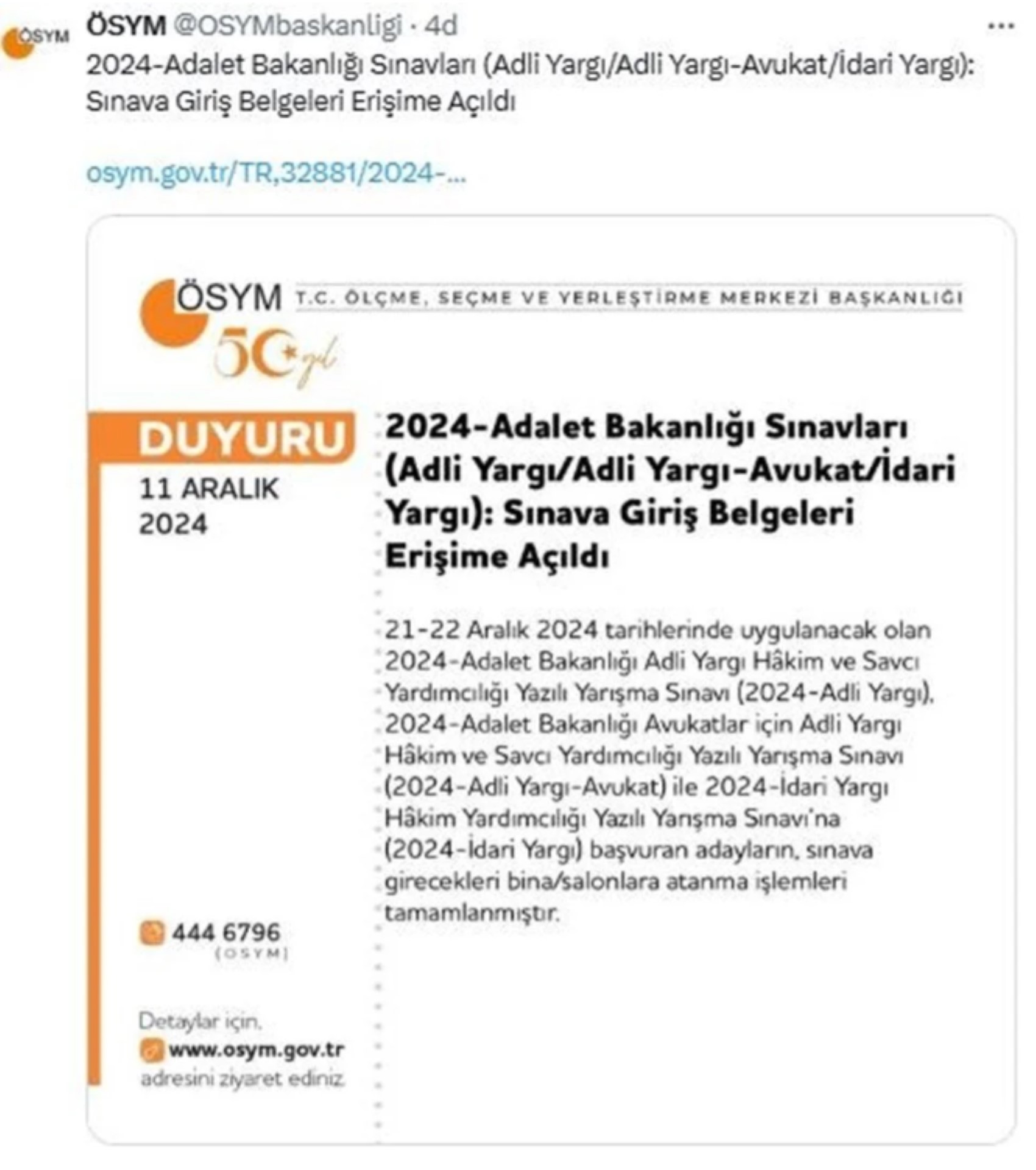 ÖSYM, 2024-Adalet Bakanlığı Sınavları (Adli Yargı/Adli Yargı-Avukat/İdari Yargı): sınava giriş belgelerinin yayımlandığını duyurdu. 21-22 Aralık 2024 tarihinde uygulanacak olan 2024-Adalet Bakanlığı Sınavlarının giriş belgeleri ÖSYM’nin https://ais.osym.gov.tr adresinden edinilebilecek.
