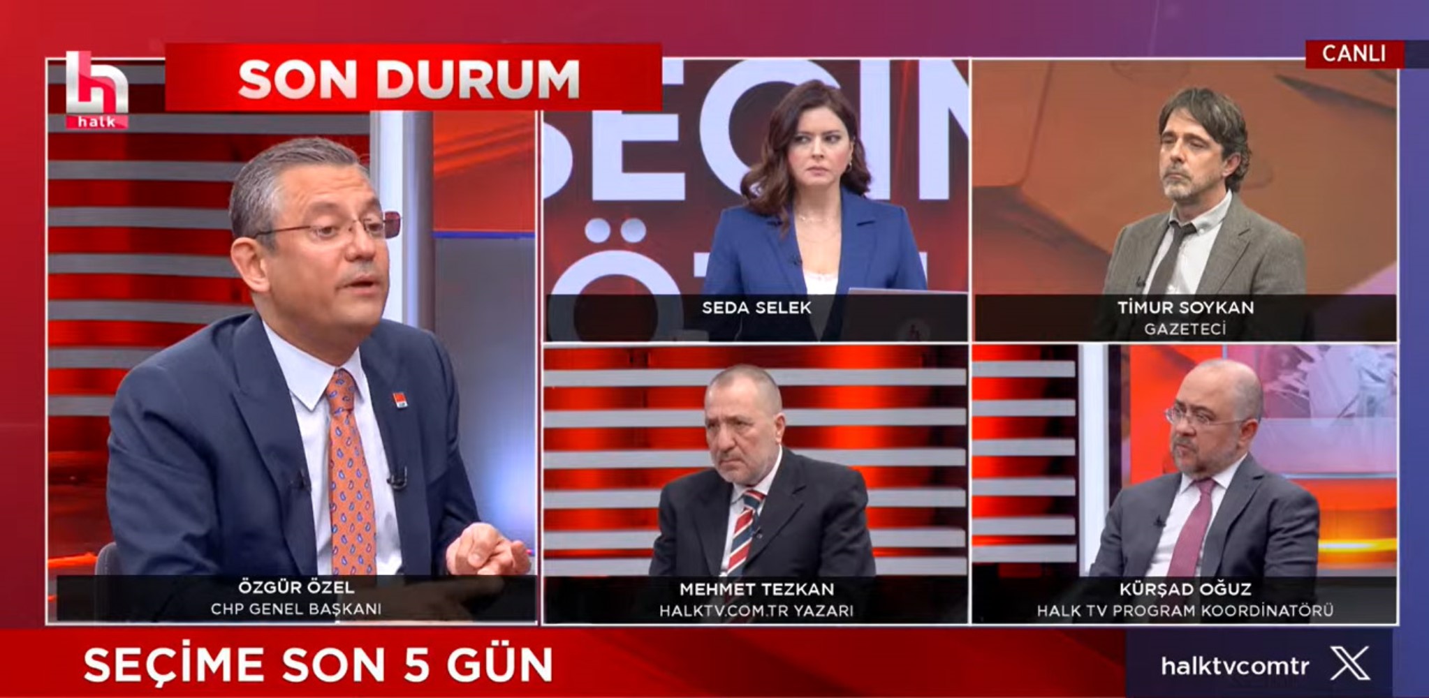 CHP Genel Başkanı Özgür Özel seçime günler kala Halk TV'nin canlı yayınına katıldı. Özel gündeme dair sorulara yanıt verdi. CHP'nin oy oranına dair açıklamalarda bulunan Özel çarpıcı açıklamalarda bulundu.